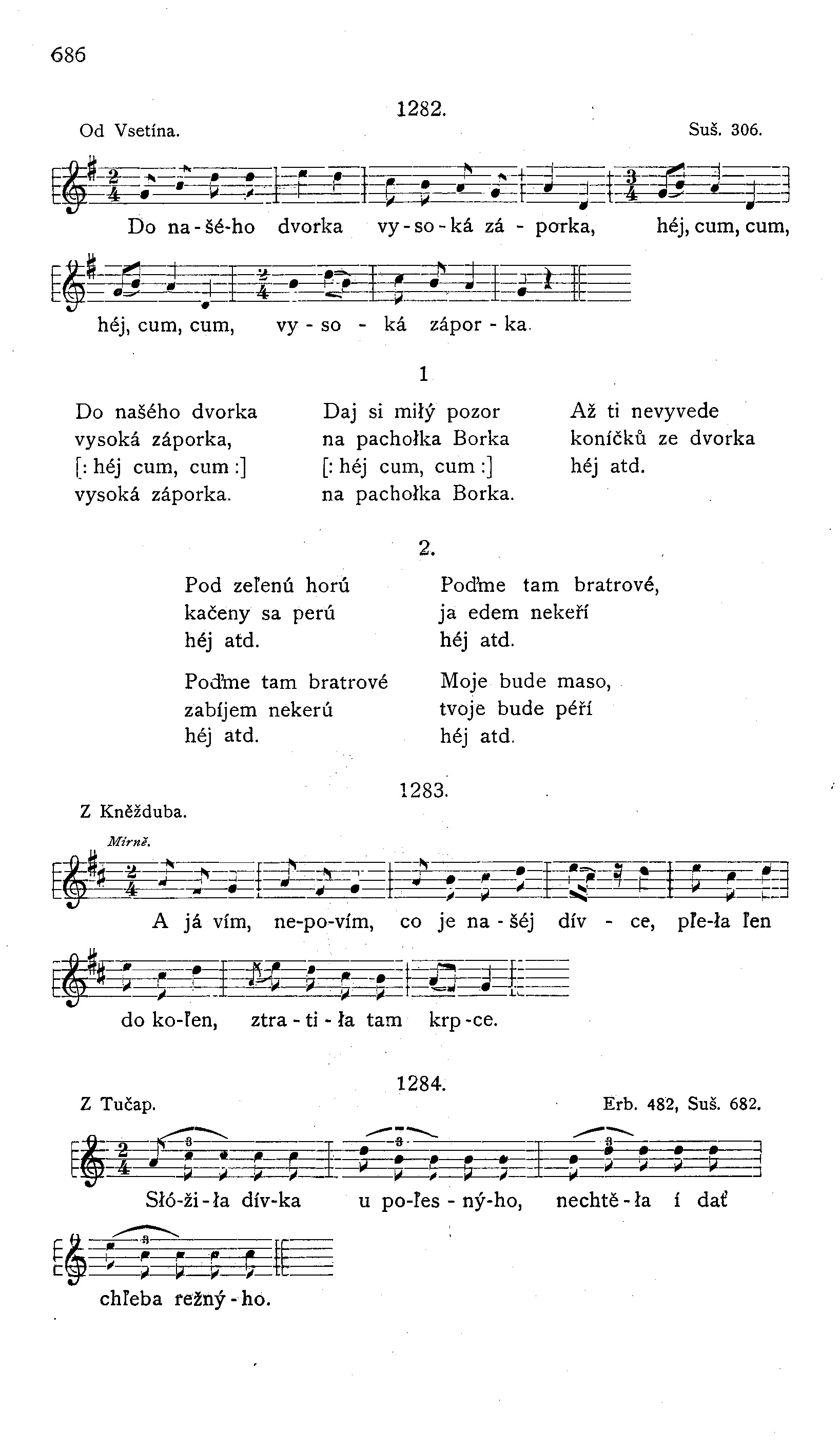 Dyž sem išéł přes ty hory, všeci vtáčkové zpívali; žádný nepłače, každý zpívá; proč si, má miłá, žałostivá? Proč bych žałostná nebyła? dyž sem poctivosť ztratiła; . už má poctivosť v poľi bývá, tobě, šohajku, vtáček zpívá. Tobě, šohaj, tobě ináč, za kłobúčkem rozmarýn máš; tobě sa ľíčka červeňajú, moje očenka płakat majú.