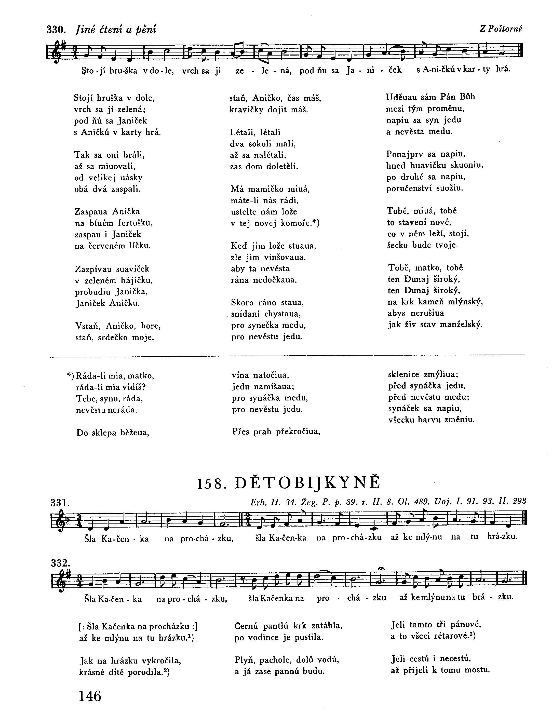 A v pondělí po neděli [: česal Heřman koně vraný. :] Přišla k němu jeho matka, přinesla mu krásné jabka. Co si, Heřman, co si smutný, zdaliž tě hlava nebolí? 1) Jak pak nemám smutný býti, dyž mám pro nevěstu jeti a domů se nevrátiti? Nejeď, Heřman, nejeď pro ni, pošli pro ni tři sta koní. Tři sta koní, to nic není, dyž já musím přece pro ni. Jak jsó mrskli, tak jsó jeli, až na tó loku přijeli. Na tó lóku na širokó, pod tó lípu pod vysokó. 2) Koníček zlámal nožičku, Heřmánek srazil hlavičku. 3) Formani só se radili, majíľ pro ni přece jeti, či se domů navrátiti. Tělo mrtvé promluvilo, by se pro ni přece jelo. »Nebude-li mně samému, bude bratrovi mladšímu.« Jak só mrskli, tak só jeli, až na její dvůr přijeli. 4) Vítám vás, páni mládenci, kde ste ženicha nechali? A ženich nám doma zůstal, aby hostům stoly chystal. Jak živa sem neviděla, jak živa sem neslyšela, aby ženich doma zůstal, aby hostům stoly chystal. Jak só mrskli, tak só jeli, až na tó lóku přijeli. Nevěsta se s vozu nahla, 5) červeno krev uhlídala. Tady vidím krev červenó, není-li to Heřmanova? 6) A to není krev člověčí, ale to je krev zvířecí. Zabil Heřman, zabil lani, aby měl hostům chystání. Jak só mrskli, tak só jeli, až na jeho dvůr přijeli. Vítám vás, páni mládenci, vítám vás, panny družičky. Tebe, nevěsto nemilá, dy bys byla krk srazila, než mého Heřmana znala! Komu pak to máti praví? Nepraví-li to mně samý? A to nepraví mně samý, a to praví Heřmanovi. Dyž počaly stolů chystat, Heřmanovi hrany zvoní. Komu pak to hrany zvoní? Nezvoní to Heřmanovi? 7) Umřelo tady děťátko, a to malé nemluvňátko. Dyž počali k stolu sedat, Heřmanovi prepus zvoní. Komu pak to prepus zvoní? Nezvoní-li Heřmanovi? Komu pak by to jinému, nežli Heřmanovi tvému? 8) Nevěsta to uslyšela, hned jim oknem vyskočila a na krchov hned běžela. 9) Jedním nožem hrob hrabala, druhým nožem k srdci jela. Kdo tady půjde, pojede, každý litovati bude. Leží tady tělo s tělem, dvě dušičky s Pánem Bohem.