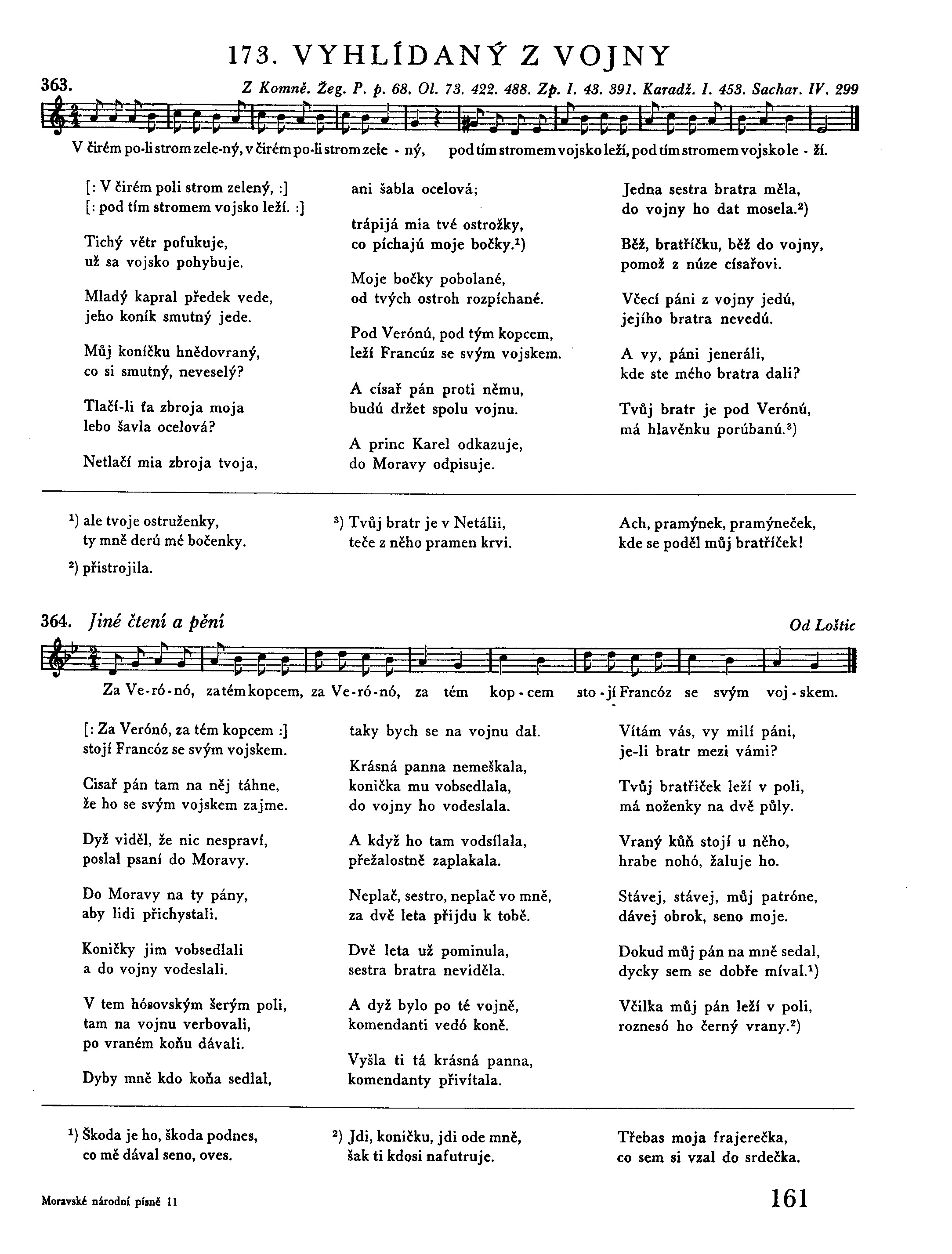 [: Na tej lúce, na zelenej, :] [: při voděnce, při studenej, :] stojí tam koníček vraný, na něm Janko porúbaný. Přišla k němu jeho máti, počala ho litovati. 1) Di, matičko, di ode mně, rozpučí sa srdce ve mně. Rozpučí sa na dva kusy, že ta vojna býti musí. Že ta vojna býti musí, že sa Janko sekat musí. Jide šavla za šavlama, krév sa leje kolajama. 2) Jedú voze s vojákama, krév sa leje kolajama.