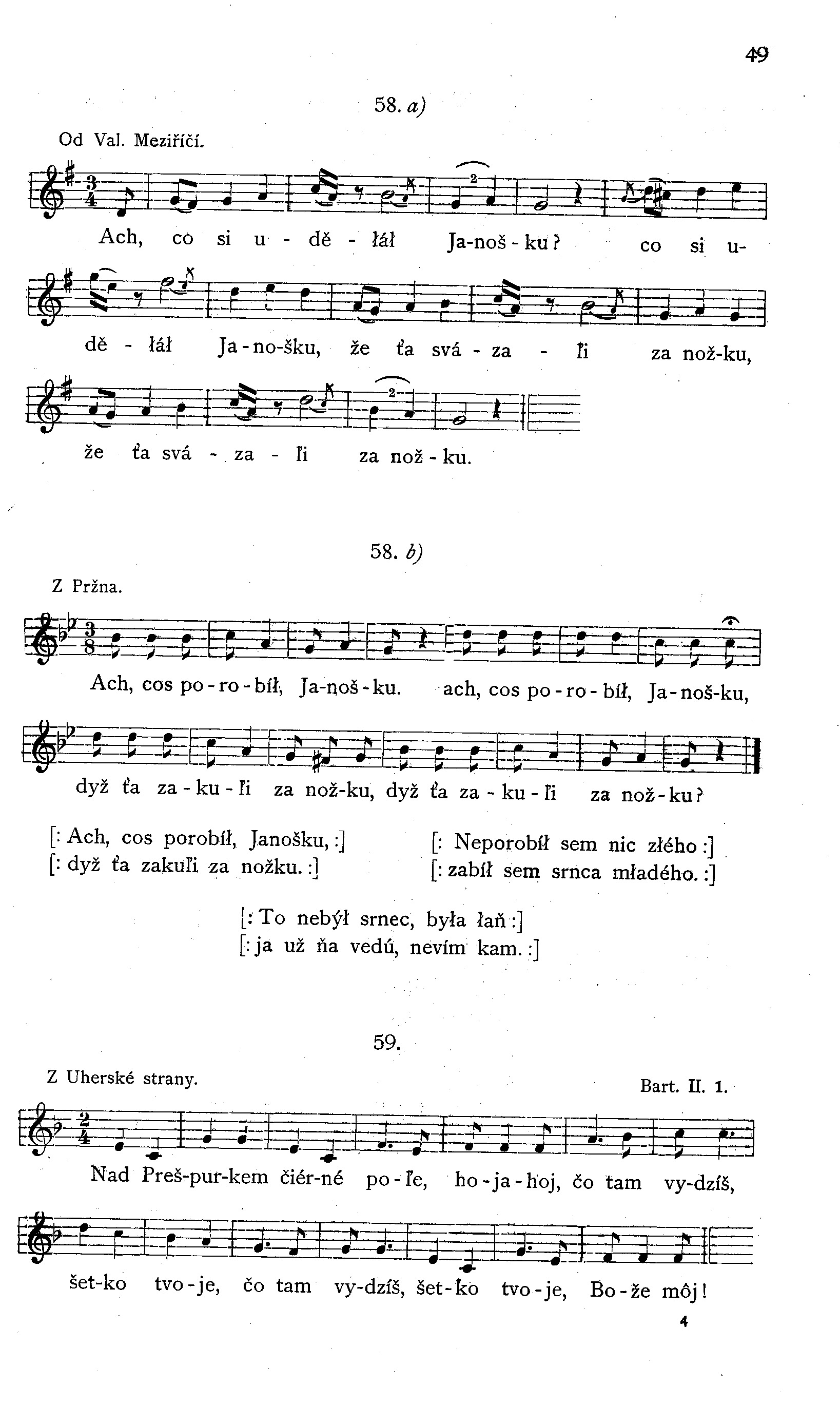 Na Turanskéj veži dvá hołubi seďá, ľudé ím záviďá, že sa rádi viďá. Ľudé, miľí ľudé, nezáviďte toľé; jak každý młádenec svú pannu miłuje. Letěla, gágała bíłá hus nad vodú; ľudé sa pýtajú, kdy ty hody budú? Budú hody, budú, v městě Pézinečku; zabił tam šohajek, svoju frajerečku. Pichéł on ju, pichéł, do bočka pravého, do bočka pravého, líčka červeného. A dyž on ju pichéł, na Boha zavołał: Ach Bože, Bože můj, co sem to uděłáł!