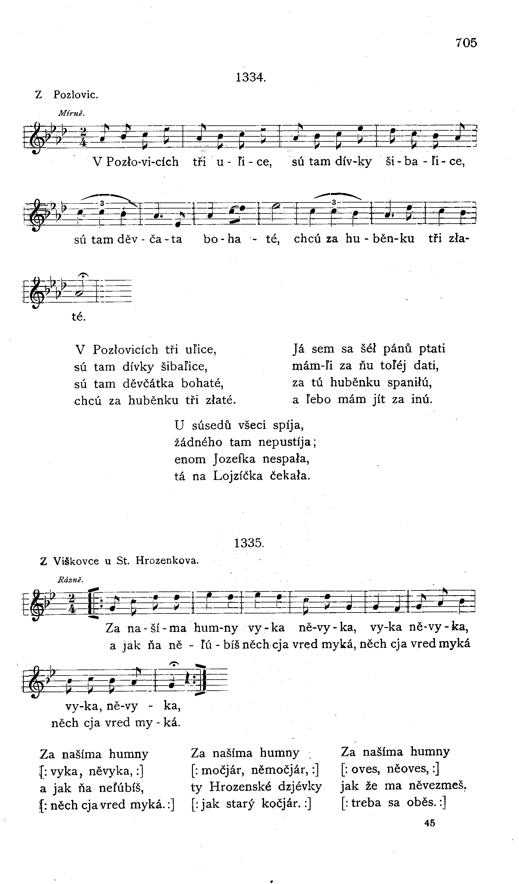 Na Březovej tři ulice, sú tam dzjevky šimbolice, sú tam dzjevenky bohaté, chcú za huběnku tři zlaté. Já som sa šjol domů pytať, mám-i za ňu tolko čítať, za její huběnku spanilú, lebo mám běžať za jinú. A doma mi radu dali, koníčka mi osedlali: Sedaj, šohajko, na něho, pojdzeš do pola čirého.
