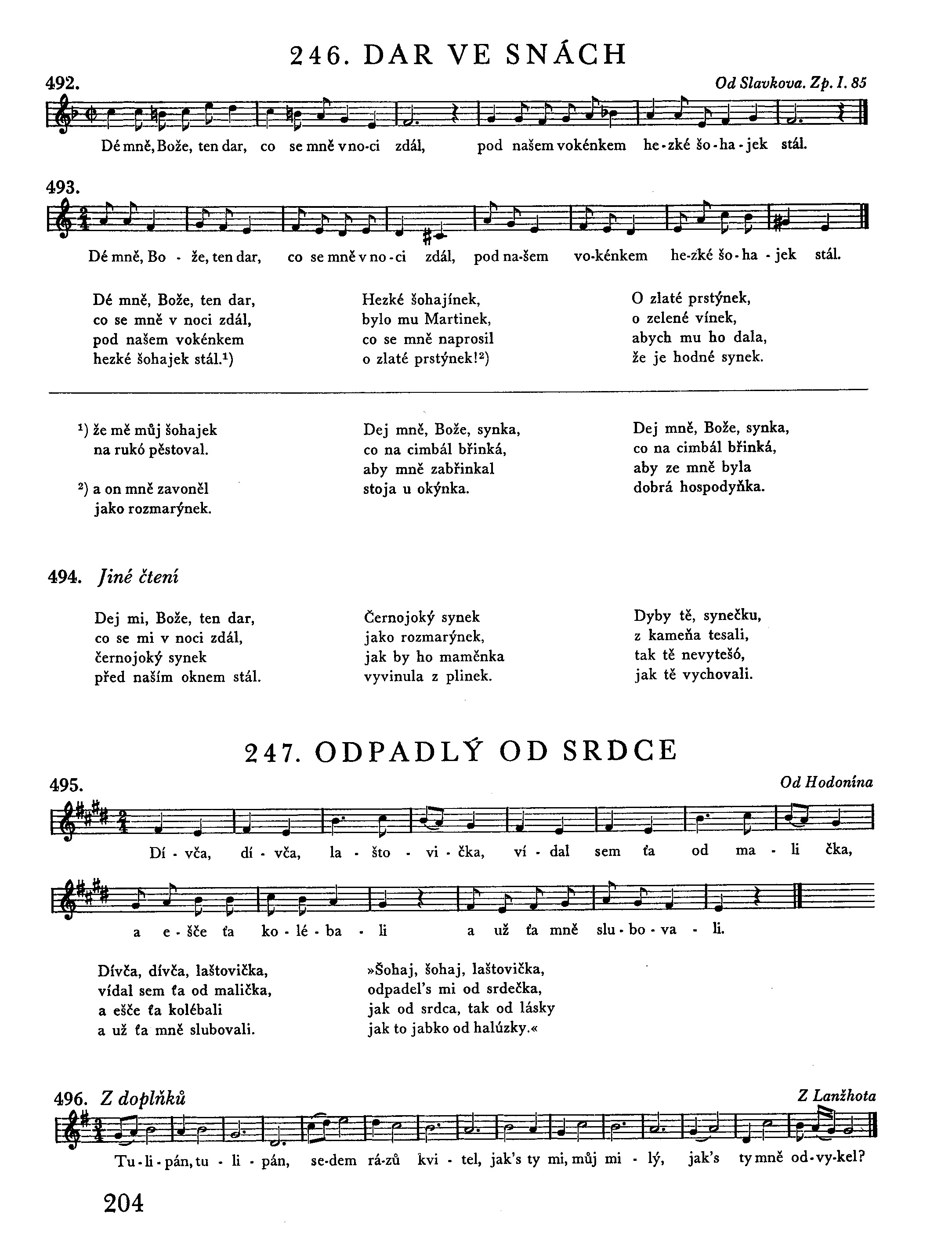 Kdy sem ja šel uličku, malu něveličku, nadešel sem svu milu, ona šla z noclehu. Milý, mocny Bože. *) Dal sem ja ji slovečko: Dař Pan Bůh, dzěvečko! A ona se ulekla, slovečka neřekla. Nělekaj se, ma mila, ja na cě něpovim. Což bys na mne povědzěl, dyž na mne nic něviš? A kata ja tež něvim, dy sem byl nad vami, ach, nad vami, nad vami, sam Pan Bůh nad nami. Což’s, mila, udzělala pod lipku zelenu? Pachole’s porodzila, tam’s ho zakopala. Něpovidaj, můj mily, dam ci na košulu, dam ci na košulu, baj ci ju ušiju. Což mi je po košuli? Košula se zdere, košula se zdere na mem hřišnem cěle, pachole něstaně. Něpovidaj, můj mily, dam ci prsteněček, zlaty prsteněček, zelený věneček. Což mi je po prstenku, po zelenem vinku? Prsteněk se zlame. 1) A vinek uvadně, pachole něstaně. Jak už bylo ve středu, už Kačenku vedu, už Kačenku vedu k mistu popravnimu. Pomodli se, Janičku, jednu modlitbičku, jednu modlitbičku za jeji dušičku.