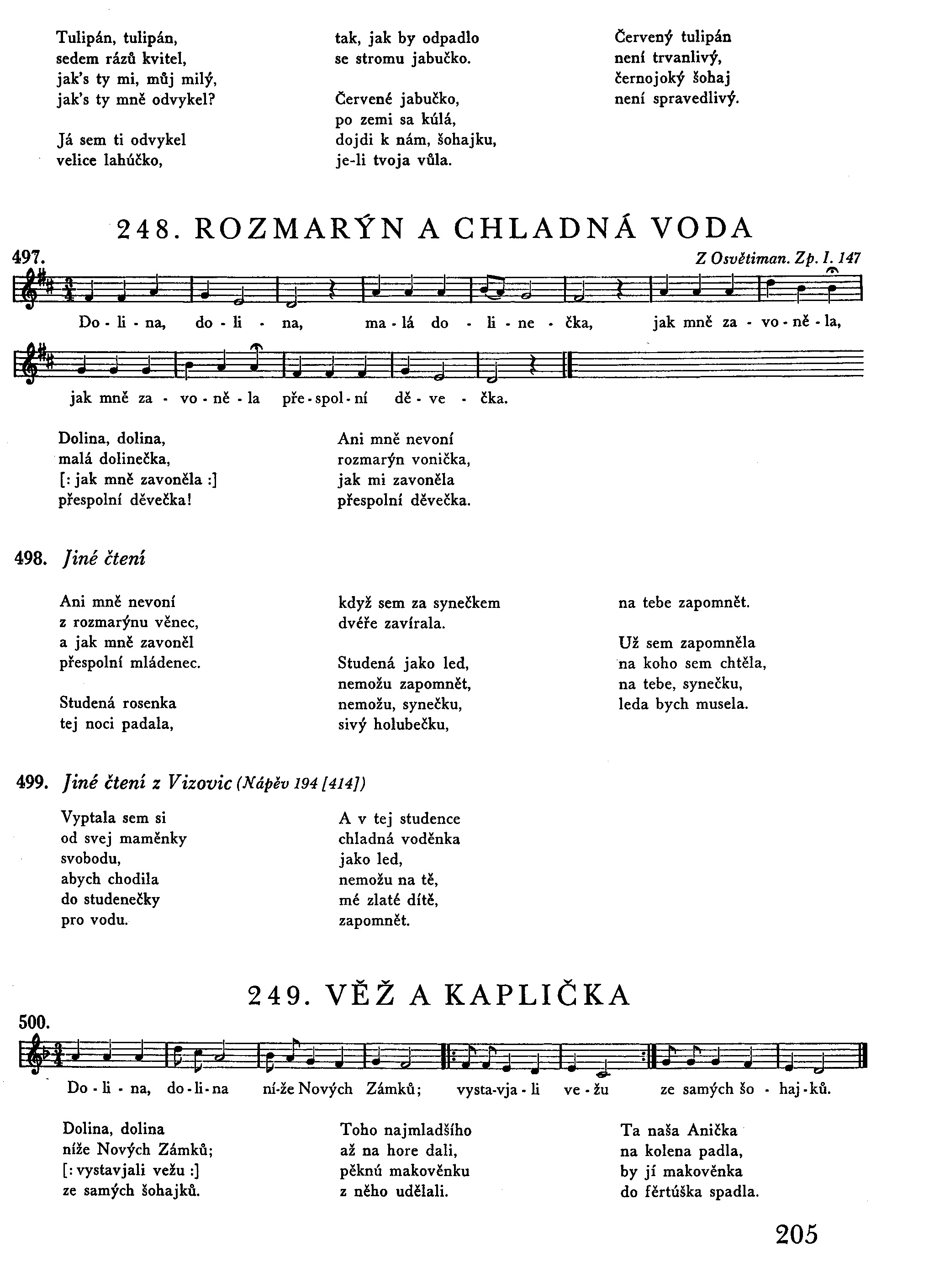 Před te naše dolinečka; neviděla sem synečka [: ani včerá, ani dnes, :] ujel za štymberské les. Ujel milé do Jevička, vzal mně klíče vod srdýčka, ach, Bože můj, Bože můj, kdypak přijde synek můj!1) Ujel za slezský hranice, vzal mně vod srdýčka klíče; vzal vod mýho, vod svýho, nenechal mně žádnýho. Vrať se, milé, vod Jevička, vrať mně klíče vod srdýčka, vrať vod mýho, vod svýho, vrať aspoň vod jedneho.