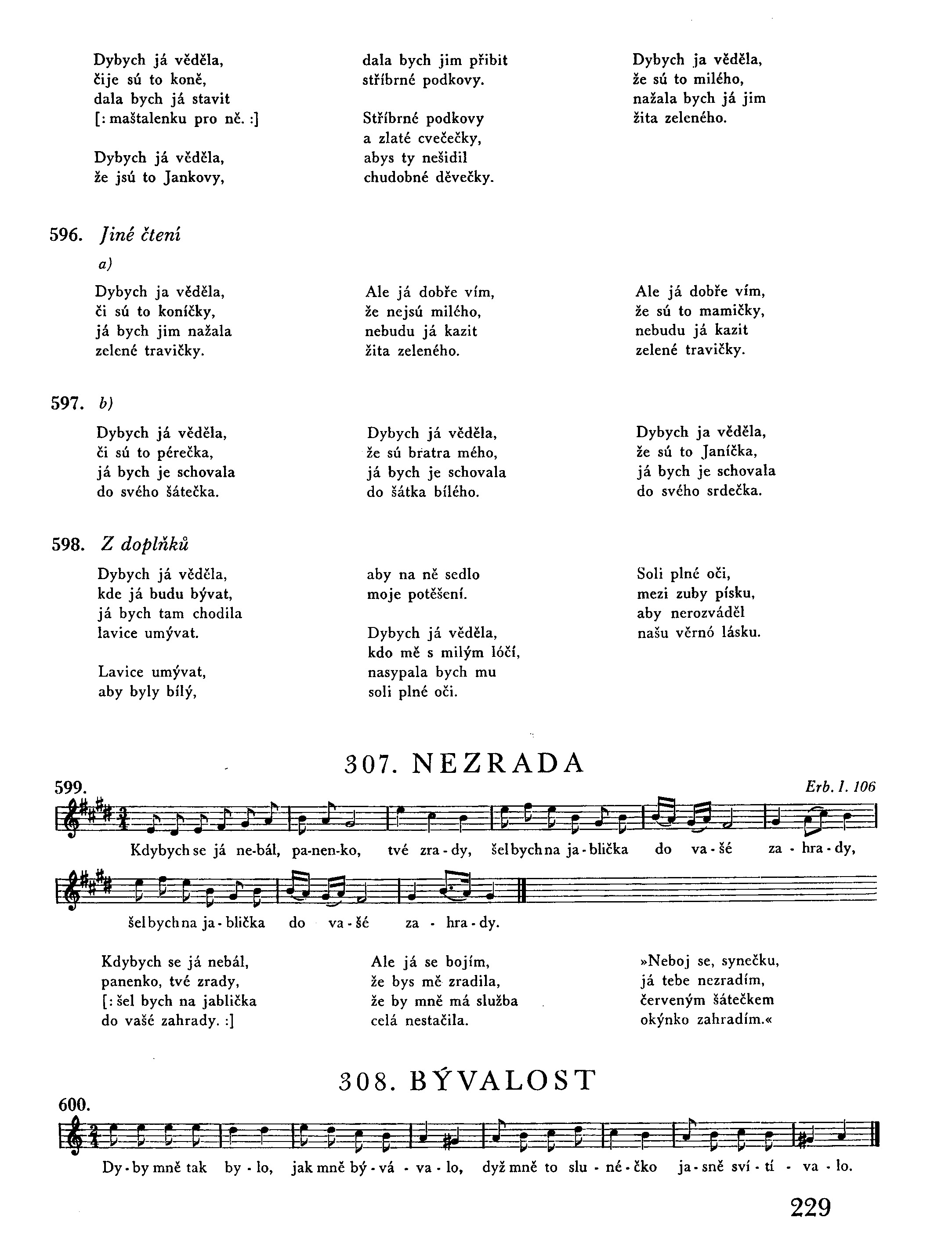 Kdybych se já nebál, panenko, tvé zrady, [: šel bych na jablička do vašé zahrady. :] Ale já se bojím, že bys mě zradila, že by mně má služba celá nestačila. »Neboj se, synečku, já tebe nezradím, červeným šátečkem okýnko zahradím.«