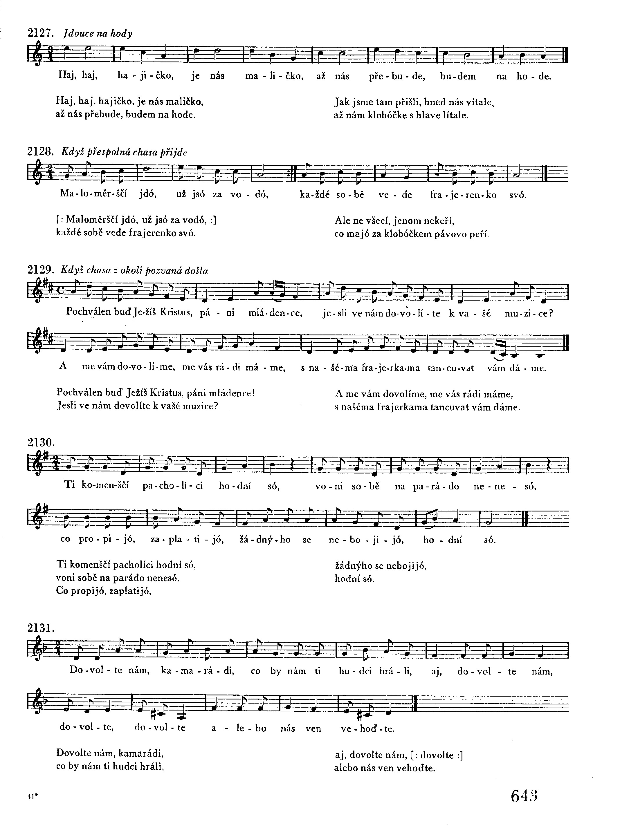Dy sem já šel přes ty lesy, zpívali vtáčkové všecí, žádný nepláče, každý zpívá: Proč jsi, má milá, žalostivá? A proč bych já neplakala a nebyla lítostivá? Už má poctivosť v celém světě, tobě, synečku, růža kvete. Tobě je, synečku, jiná, za klobóčkem páví píra, tobě se léčka červenajó, mé černé oči naříkajó. Ach, vy panenky rozmily, kerý ste ješče poctivy! Ach, nemilujte pěti, šesti, klaďte to sobě za neščestí.