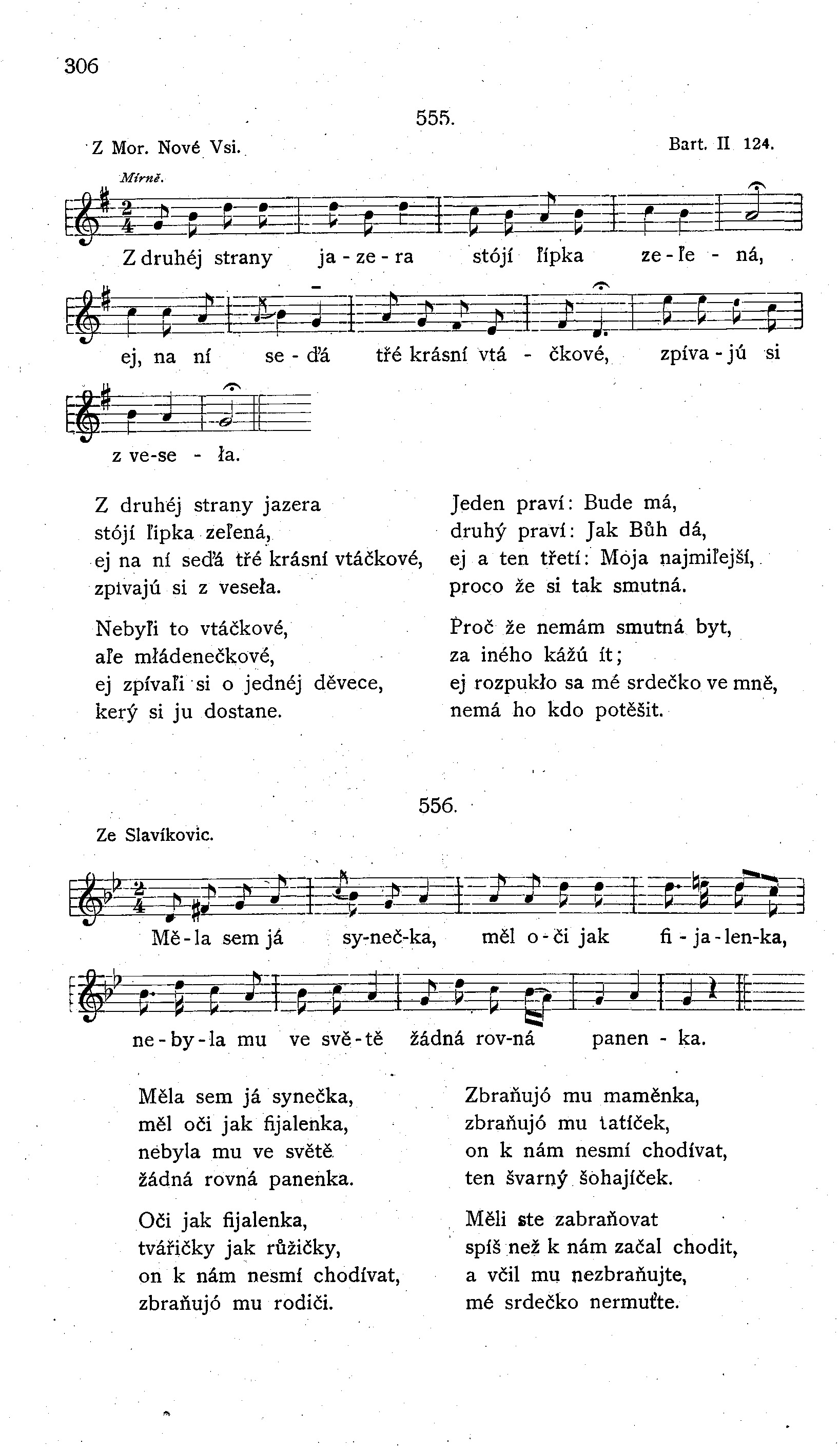 U našeho jazera stoji lipka zelena,1) a na tej lipě, na tej zelenej zpivaju tři ptačkové. A ňejsu to ptačkove, to jsu šohajičkove, rozmluvaju o švarnej děvčině,2) keremu se dostaně? Jeden pravi: Budzě ma; a ten druhy: Jak Bůh da, ten třeci pravi: Srdečko moje, pročpak si ty tak smutna. Jakpak němam smutna byč, za stareho kažu isč, rozželilo se srdeňko moje, němožu ho ukojič.3)