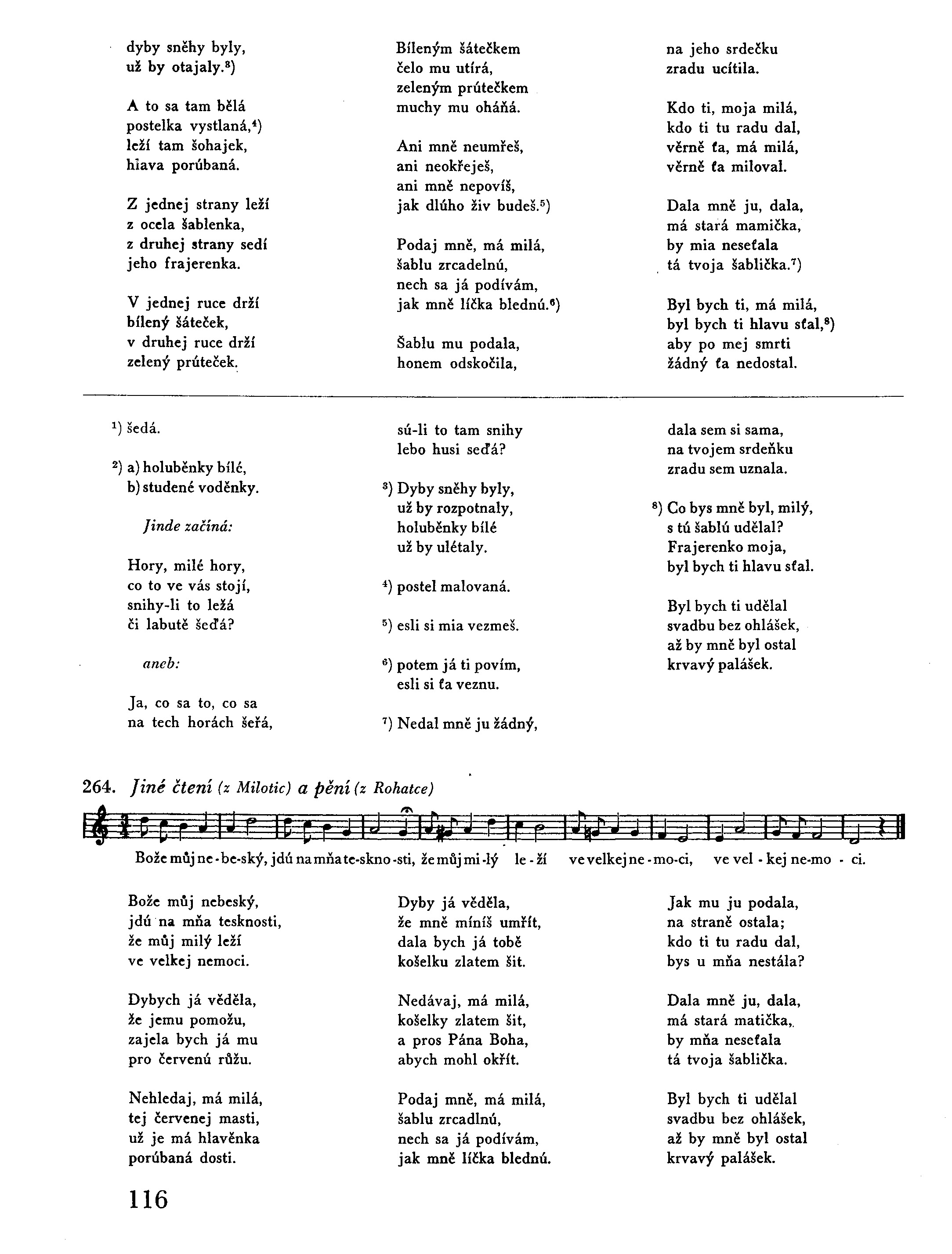Bože můj nebeský, jdú na mňa tesknosti, že můj milý leží ve velkej nemoci. Dybych já věděla, že jemu pomožu, zajela bych já mu pro červenú růžu. Nehledaj, má milá, tej červenej masti, už je má hlavěnka porúbaná dosti. Dyby já věděla, že mně míníš umřít, dala bych já tobě košelku zlatem šit. Nedávaj, má milá, košelky zlatem šit, a pros Pána Boha, abych mohl okřít. Podaj mně, má milá, šablu zrcadlnú, nech sa já podívám, jak mně líčka blednú. Jak mu ju podala, na straně ostala; kdo ti tu radu dal, bys u mňa nestála? Dala mně ju, dala, má stará matička,, by mňa neseťala tá tvoja šablička. Byl bych ti udělal svadbu bez ohlášek, až by mně byl ostal krvavý palášek.