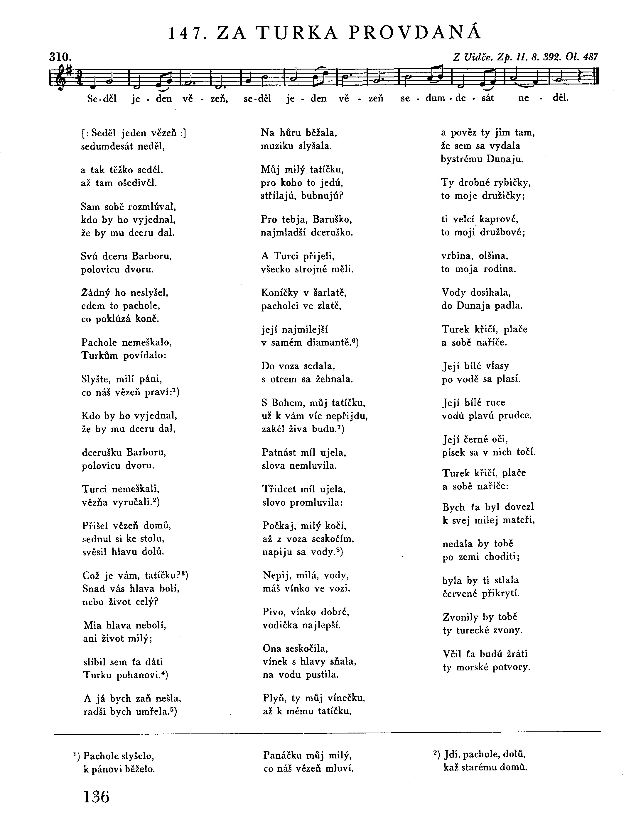 [: Seděl jeden vězeň :] sedumdesát neděl, a tak těžko seděl, až tam ošedivěl. Sam sobě rozmlúval, kdo by ho vyjednal, že by mu dceru dal. Svú dceru Barboru, polovicu dvoru. Žádný ho neslyšel, edem to pachole, co poklúzá koně. Pachole nemeškalo, Turkům povídalo: Slyšte, milí páni, co náš vězeň praví: 1) Kdo by ho vyjednal, že by mu dceru dal, dcerušku Barboru, polovicu dvoru. Turci nemeškali, vězňa vyručali. 2) Přišel vězeň domů, sednul si ke stolu, svěsil hlavu dolů. Což je vám, tatíčku? 3) Snad vás hlava bolí, nebo život celý? Mia hlava nebolí, ani život milý; slíbil sem ťa dáti Turku pohanovi. 4) A já bych zaň nešla, radši bych umřela. 5) Na hůru běžala, muziku slyšala. Můj milý tatíčku, pro koho to jedú, střílajú, bubnujú? Pro tebja, Baruško, najmladší dceruško. A Turci přijeli, všecko strojné měli. Koníčky v šarlatě, pacholci ve zlatě, její najmilejší v samém diamantě. 6) Do voza sedala, s otcem sa žehnala. S Bohem, můj tatíčku, už k vám víc nepřijdu, zakél živa budu. 7) Patnást míl ujela, slova nemluvila. Třidcet míl ujela, slovo promluvila: Počkaj, milý kočí, až z voza seskočím, napiju sa vody. 8) Nepij, milá, vody, máš vínko ve vozi. Pivo, vínko dobré, vodička najlepší. Ona seskočila, vínek s hlavy sňala, na vodu pustila. Plyň, ty můj vínečku, až k mému tatíčku, a pověz ty jim tam, že sem sa vydala bystrému Dunaju. Ty drobné rybičky, to moje družičky; ti velcí kaprové, to moji družbové; vrbina, olšina, to moja rodina. Vody dosihala, do Dunaja padla. Turek křičí, plače a sobě naříče. Její bílé vlasy po vodě sa plasí. Její bílé ruce vodú plavú prudce. Její černé oči, písek sa v nich točí. Turek křičí, plače a sobě naříče: Bych ťa byl dovezl k svej milej mateři, nedala by tobě po zemi choditi; byla by ti stlala červené přikrytí. Zvonily by tobě ty turecké zvony. Včil ťa budú žráti ty morské potvory.
