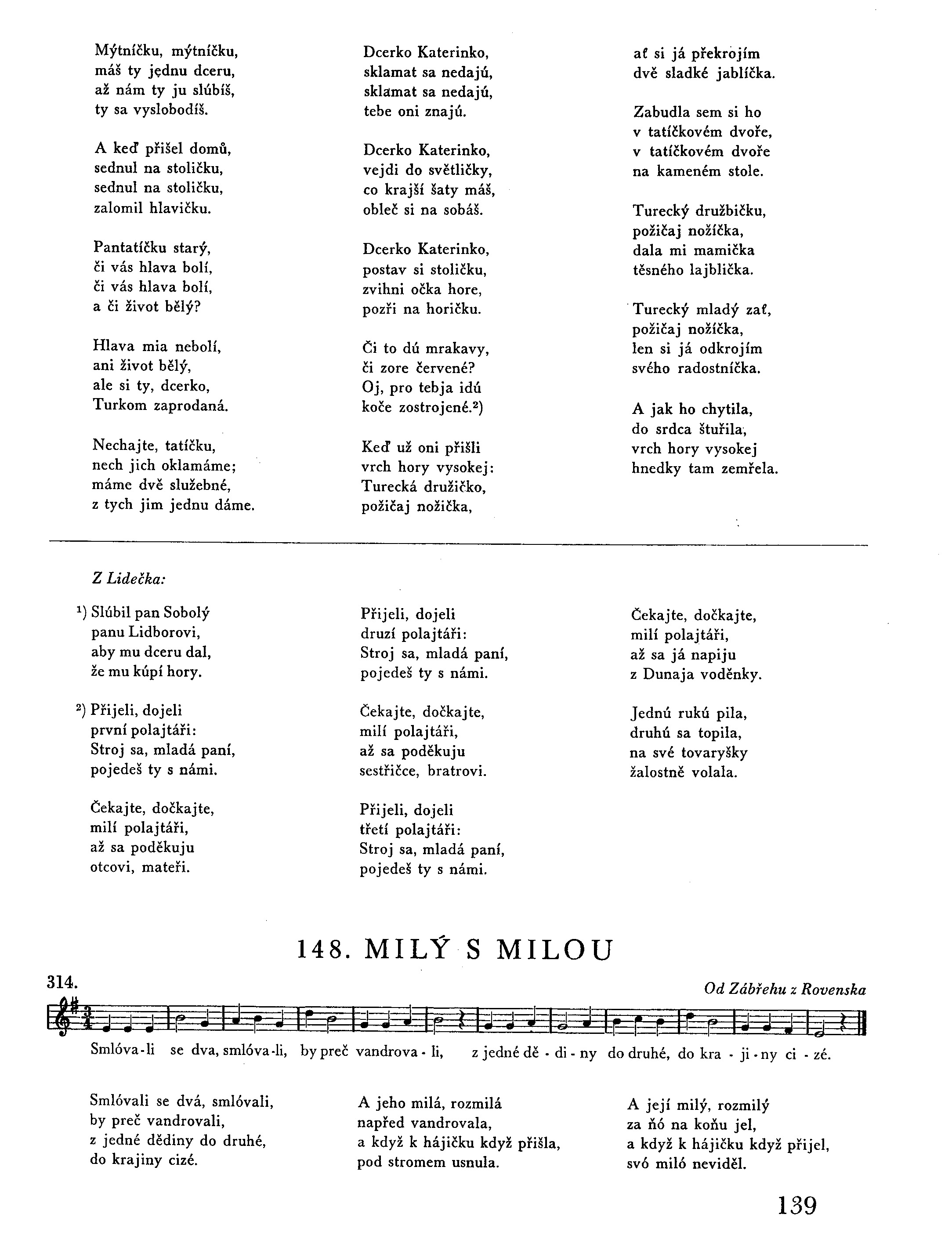 Smlóvali se dvá, smlóvali, by preč vandrovali, z jedné dědiny do druhé, do krajiny cizé. A jeho milá, rozmilá napřed vandrovala, a když k hájičku když přišla, pod stromem usnula. A její milý, rozmilý za ňó na koňu jel, a když k hájičku když přijel, svó miló neviděl. Zavolal hlasem velikým: Ach, má milá, kde jsi? Zda-li tě zvěř neroznesla, lebo zabitá jsi? Uvázal koňa u duba, sám klek' na kolena, vytáhl z pošvy ostrý meč, uťal si hlavu preč. A jeho milá, rozmilá ze sna procítila, viděla ho zabitého, kůň stojí u něho. Měla tě milá dva nože, oba balzanovy, jedněm sobě hrob kopala, druhém se zabila. Ach, položte nás, položte do jednoho hrobu, aby naše věrné duše přišly k Pánu Bohu. Ach, položte nás, položte až tam na rozcestí, kady dobří lidi chodí, formánkové jezdí. Kdo tady půjde, pojede, ať na nás zpomene, tudy leží milý s miló. obá zabití jsó. Kdo tady půjde, pojede, ať sobě zpomene, tu leží milý pro miló, milá pro milého.