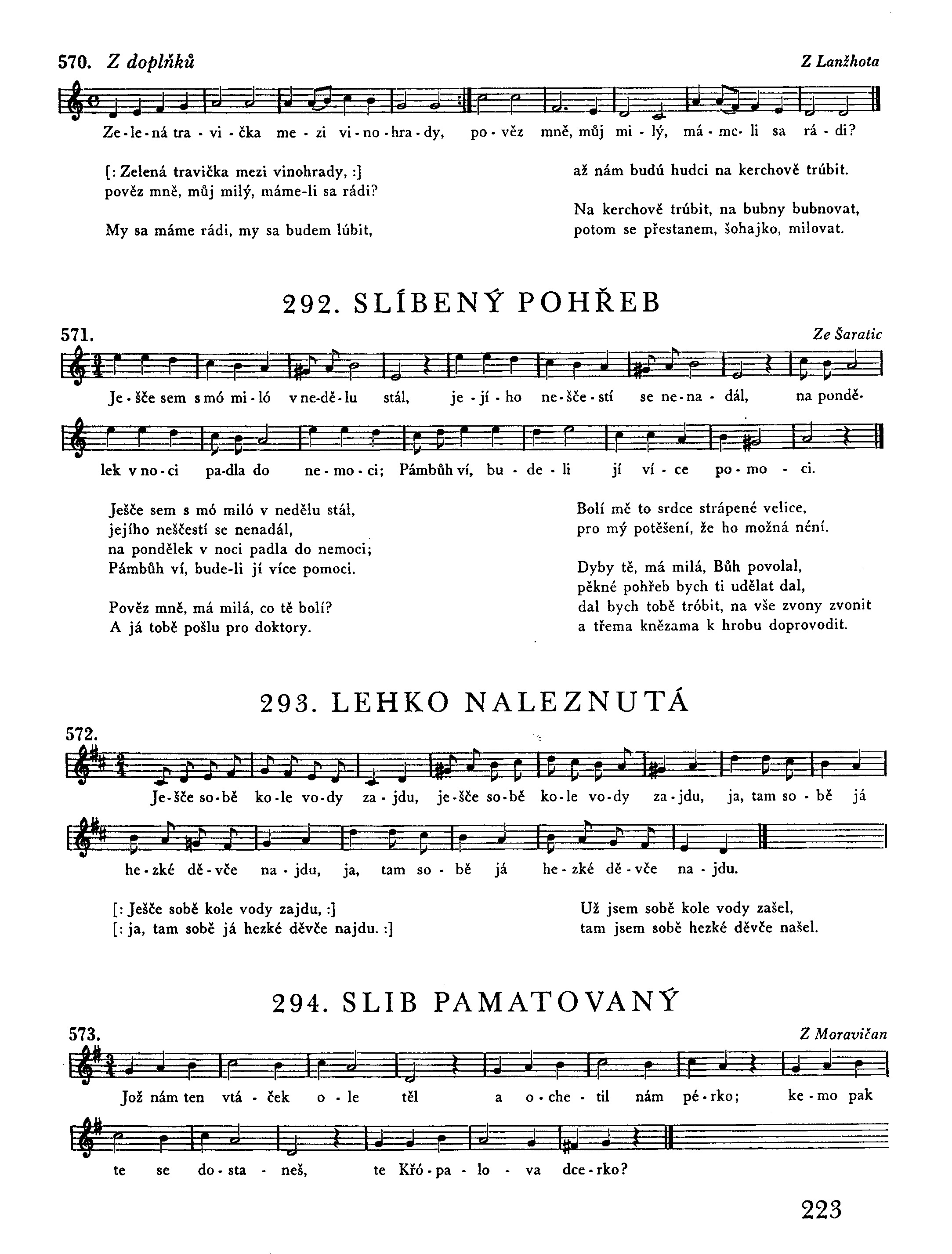 [: Žalo dívča, Žalo trávu :] nedaleko Velehradu. 1) Mladý pán sa z okna dívá, pro její krásu omdlívá. 2) Širuj, kočí, širuj koně, pojedeme v čiré pole. Přes to pole, přes široké, najdem dívča černooké. Dyž na tu lúku přijeli, na děvčátko zavolali. »Kdo ti kázal trávu žati? Musíš za to základ dati.« Kázali mně otec, máti, ti mia budú vymlúvati. Co ty, dívča, co ty nám dáš, dyž ty tu trávu kosíváš? Dávala jim srp, plachtičku; ej, my chceme tvú ručičku. Jak bych já vám ruku dala? Já su dcera pastýřova. Třeba si ty pastýřova, sedaj s námi do kočára. Jak do kočára sedala, k Velehradu pohlédala. 3) Co ty, dívča, sa ohlédáš, zdáli ty tam někoho máš? Já pohlédám k Velehradu, mé sestřičky tam smítajú. 4) Mladší sestra povazuje, starší za ňú prozpěvuje. Mé sestřičky, s Pánem Bohem, ej, já musím s tímto pánem. Ani sem sa nenadála, že bych měla muža pána. Já sem sa také nenadál, že bych sobě pastýřku vzal.