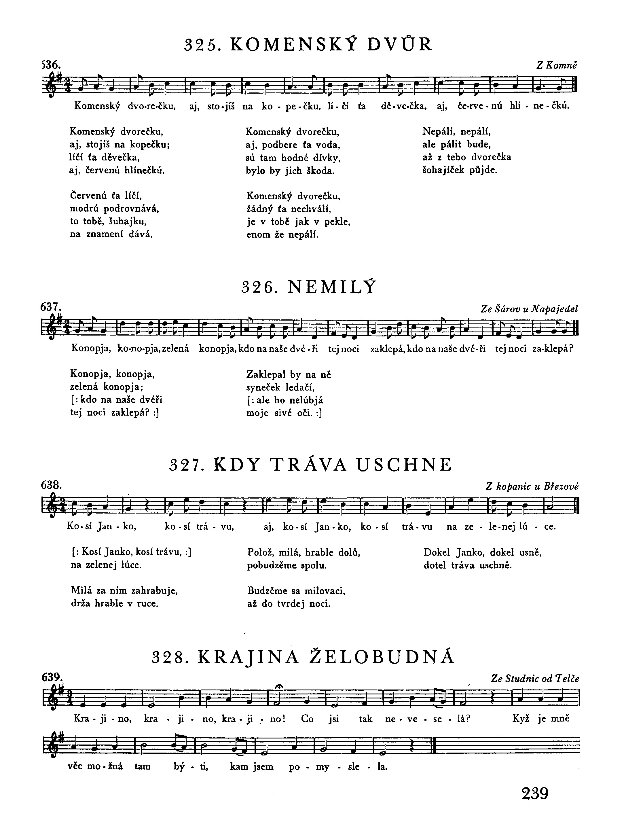 [: Kosí Janko, kosí trávu, :] na zelenej lúce. Milá za ním zahrabuje, drža hrable v ruce. Polož, milá, hrable dolů, pobudzěme spolu. Budzěme sa milovaci, až do tvrdej noci. Dokel Janko, dokel usně, dotel tráva uschně.