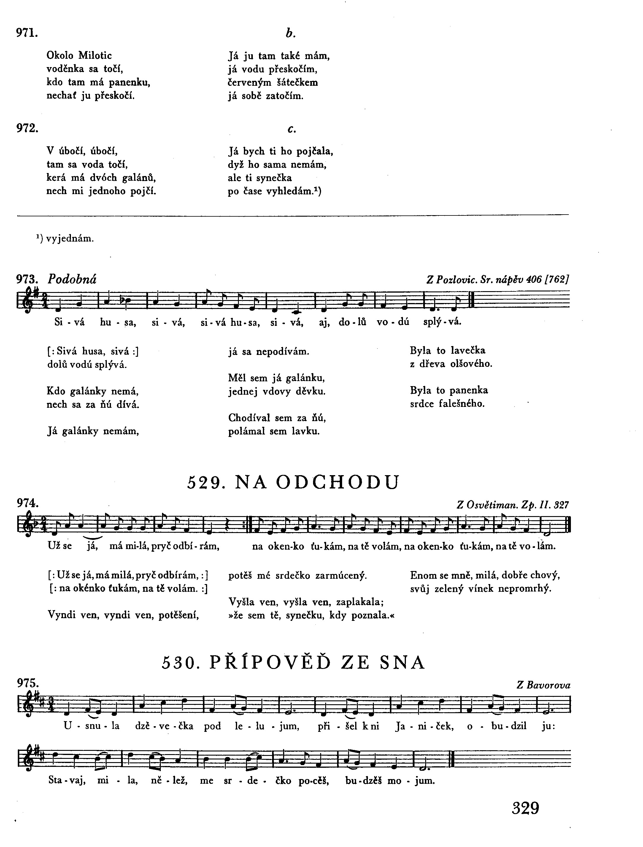 Čija to dzěvečka po zahradzě chodzi? Svoje bile nožky po rosičce brodzi. Drobne fialečky, rosičku zbirala, svojemu milemu věnek hotovala. Komuž ja uboha ten věnek hotuju? Něni ho ve svěcě, co ja ho miluju. Něni ho ve svěcě, ani ho něbudzě, mily, mocny Bože, teskno je mi všadzě. Mijales mě, mijal, přeces mě něminul, bodejes, kochanku, ve svěcě zahynul. Bodej cě, kochanku, ve svěcě zabili, nežli mu hlavičku vrunbkem obvinuli.