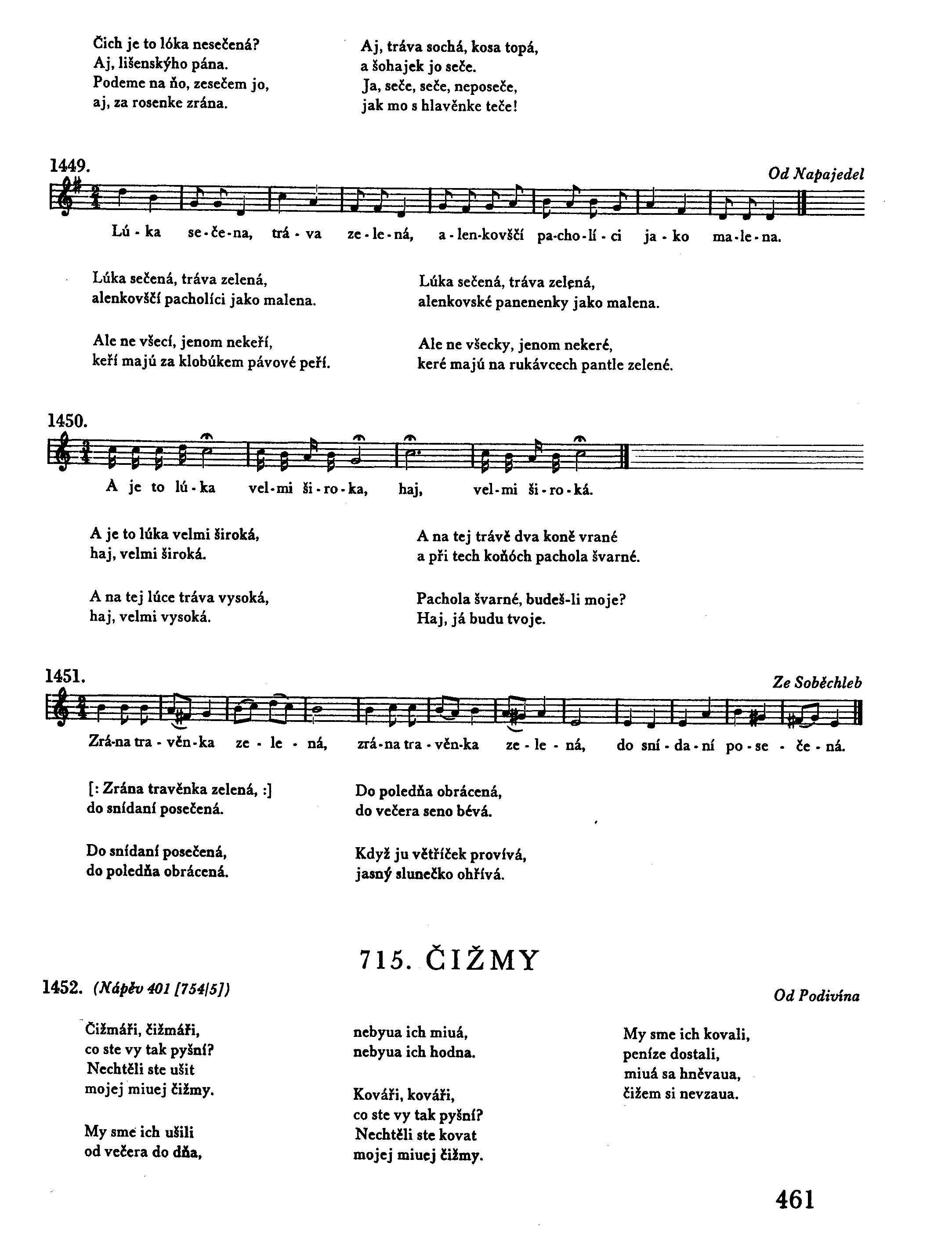 [: Zrána travěnka zelená, :] do snídaní posečená. Do snídaní posečená, do poledňa obrácená. Do poledňa obrácená, do večera seno bévá. Když ju větříček provívá, jasný slunečko ohřívá.