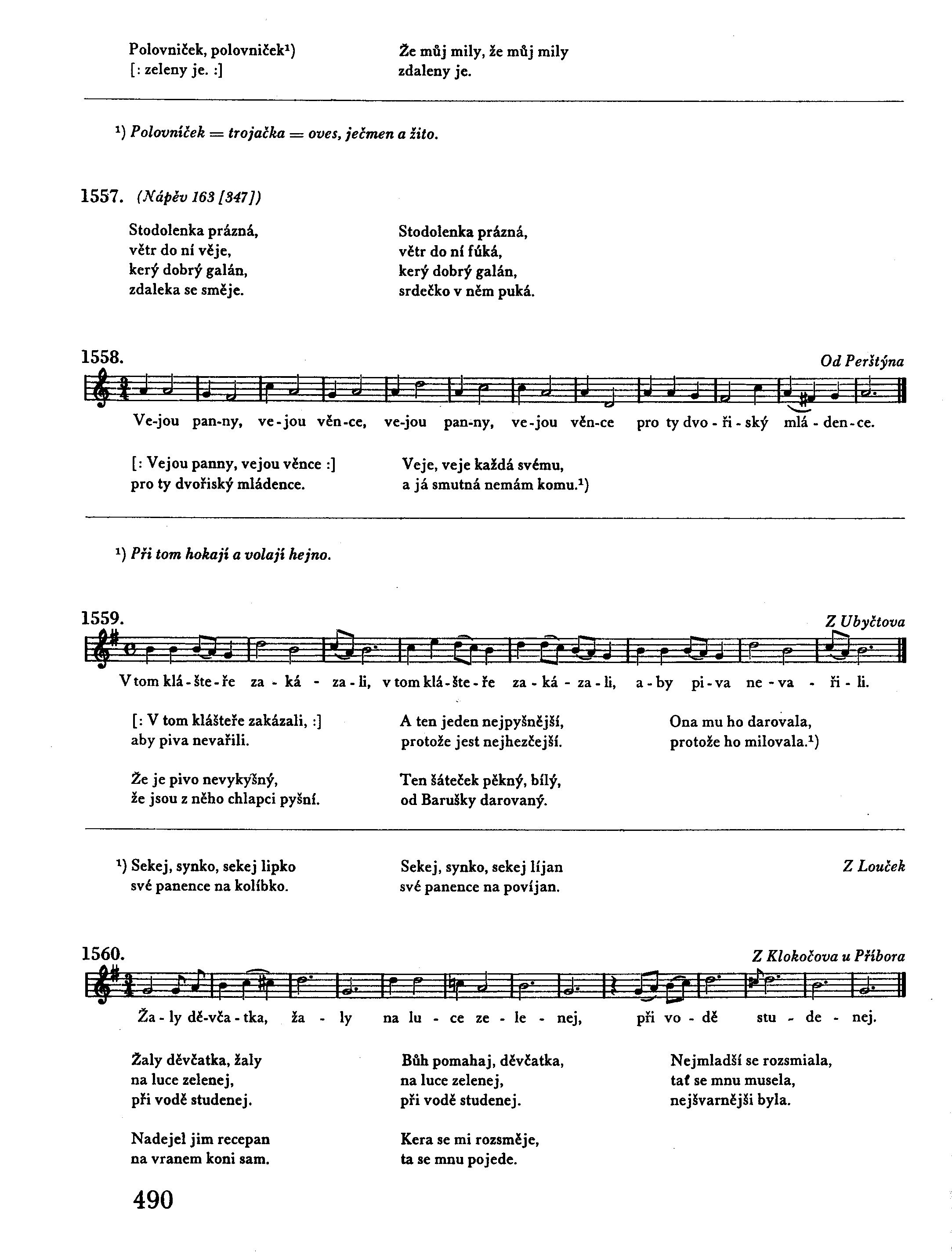 Skoro rano, raňusěnko rosenka pada,1) a to moja galanečka kravy vyhaňa. Vyhnala ich na polečko a šla do domu, nadejel ju švarny synek na branym koňu. A copak ty, galanečko, co za hostě maš, ja, že ty tak raňusěnko kravy vyhaňaš? Co se ty ptaš, můj synečku, co za hostě mam, dy si mne ty už opustil, ja jinšiho mam.