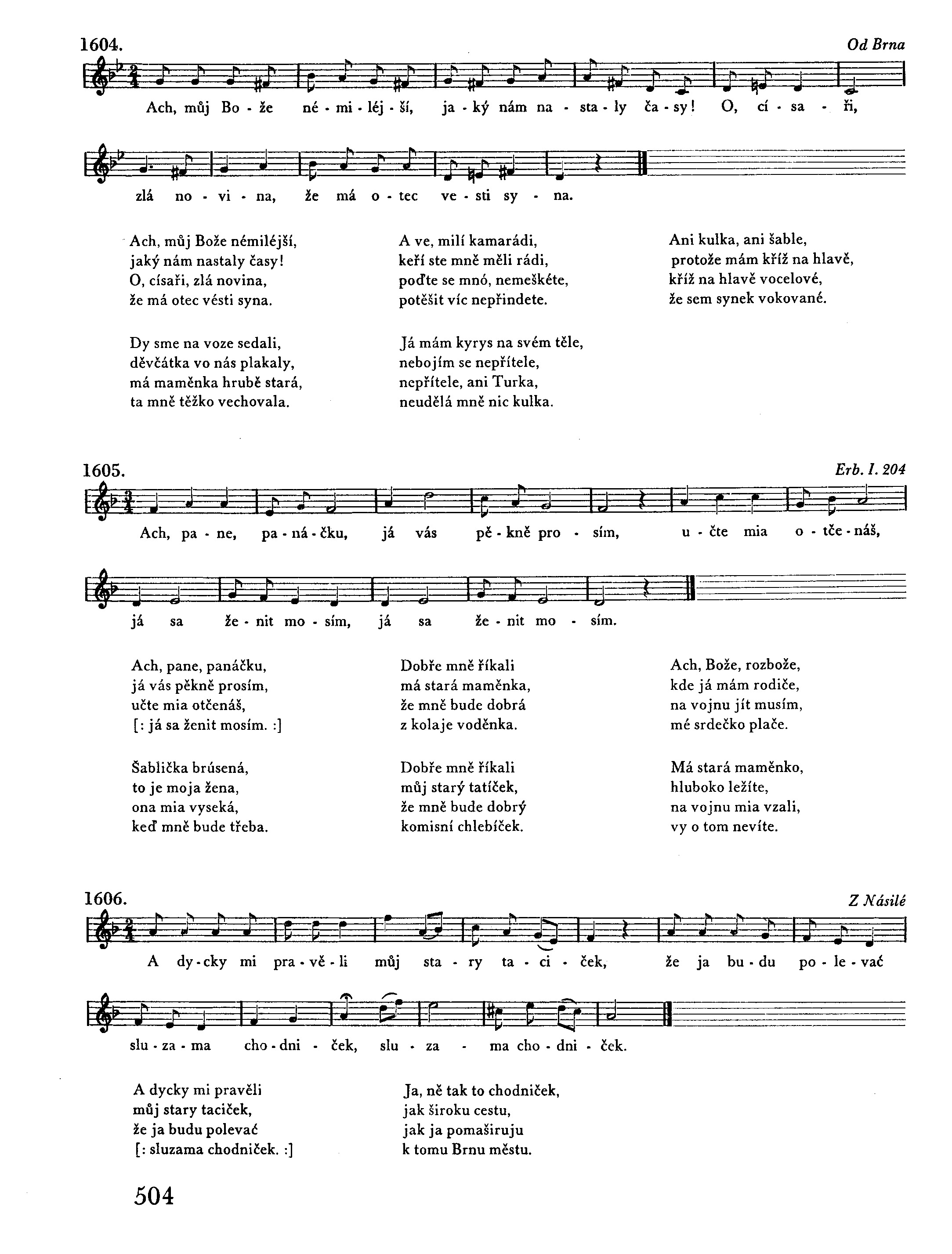 [: V tem čejkovským šenku :] [: vojáci čekajú, :] ti čejkovščí chlapci na voze sedajú. Švárnýho šohajka napřed posadili; té jeho maměnce srdce zarmútili. Ta jeho maměnka plače pod návratím, že se jí synáček z Brna nenavrátí. On se nenavrátí, ani možná néní. Už on maširoval do francúzskej zemi. K Brnu je cestečka, od Brna chodníček; už se nenavrátí švarný šohajíček.