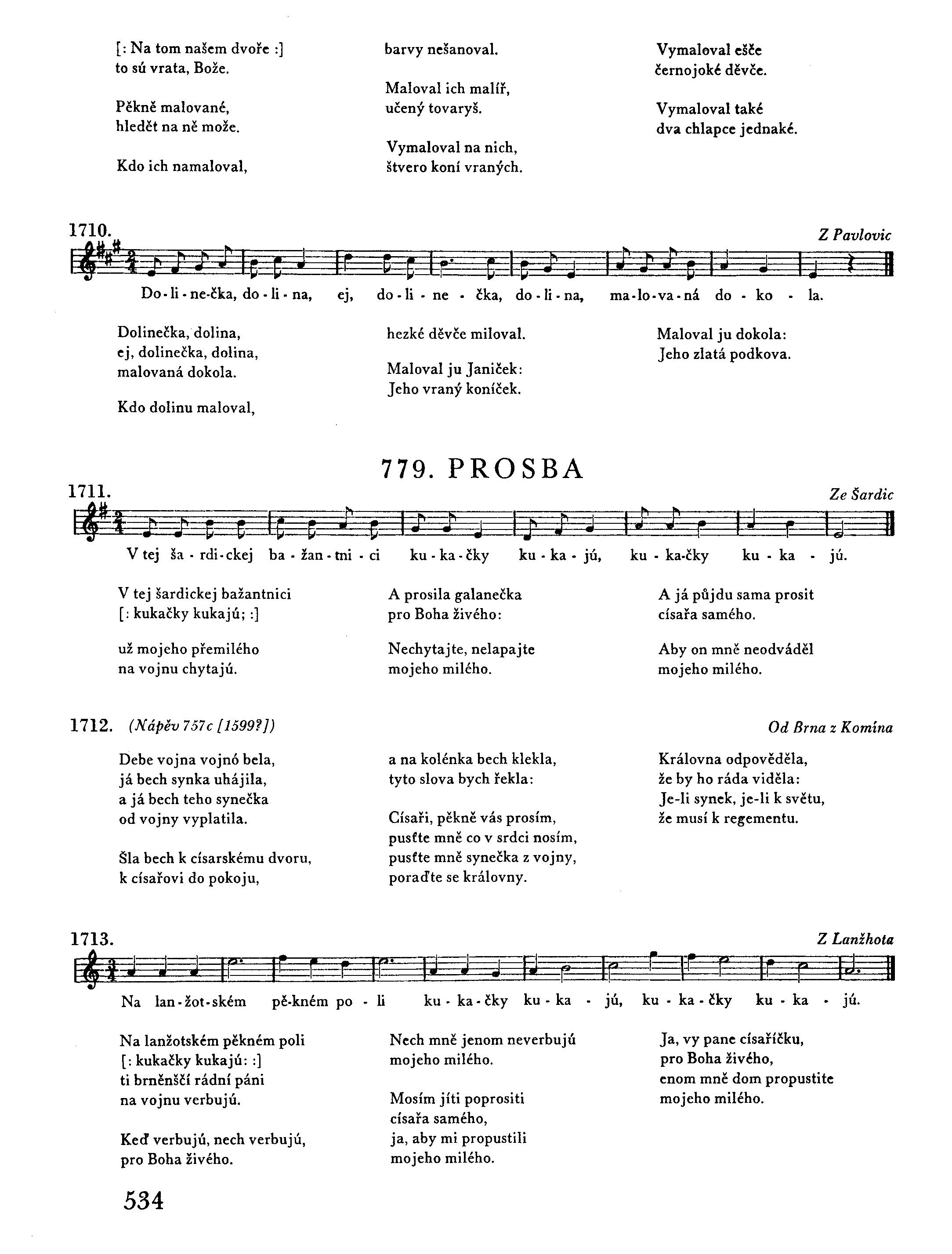 Na lanžotském pěkném poli [: kukačky kukajú: :] ti brněnščí rádní páni na vojnu verbujú. Keď verbujú, nech verbujú, pro Boha živého. Nech mně jenom neverbujú mojeho milého. Mosím jíti poprositi císařa samého, ja, aby mi propustili mojeho milého. Ja, vy pane císaříčku, pro Boha živého, enom mně dom propustite mojeho milého.