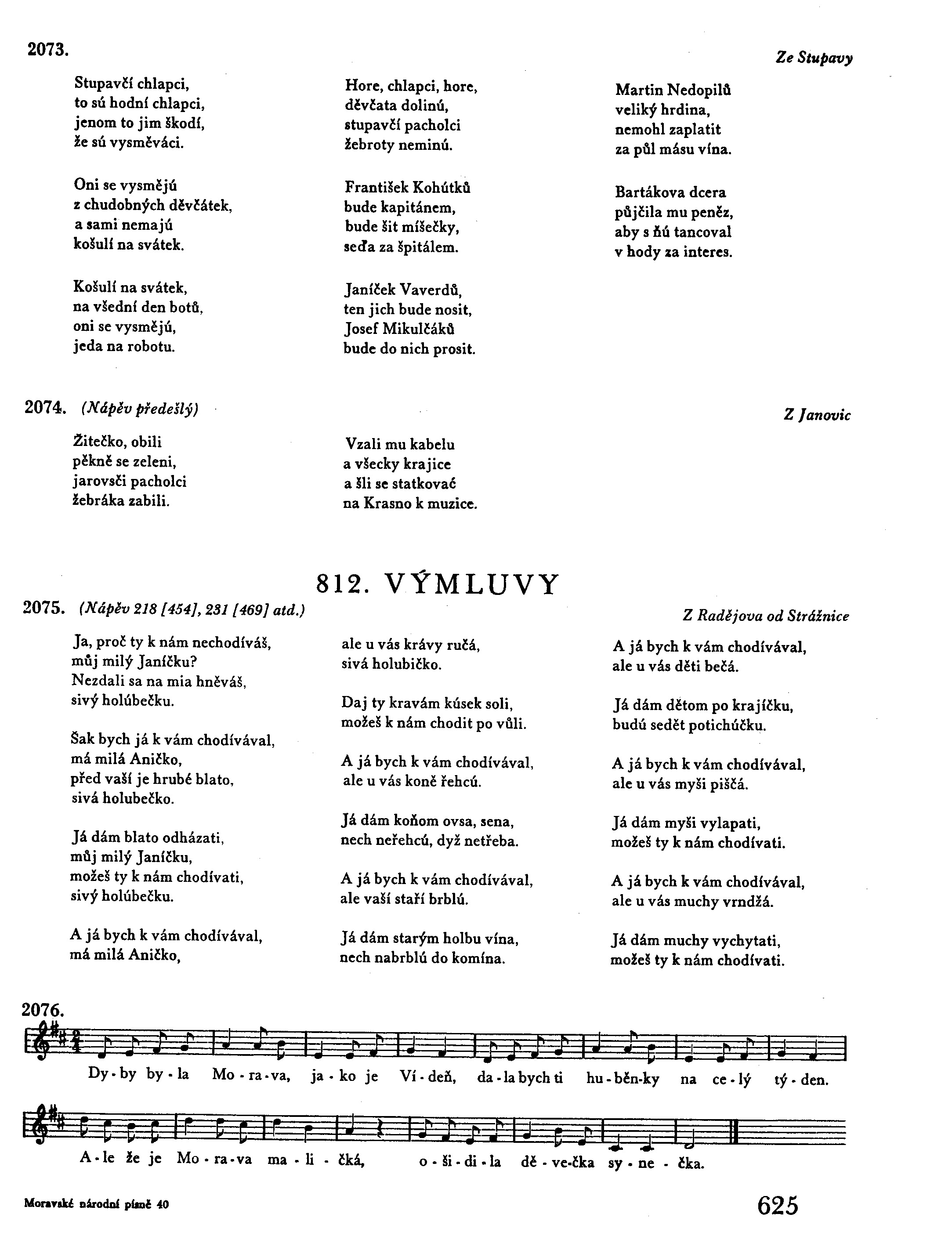 Dyby byla Morava, jako je Vídeň, dala bych ti huběnky na celý týden. Ale že je Morava maličká, ošidila děvečka synečka. Dyby byla Morava, jako jsou Čechy, dala bych ti huběnky ze štyry měchy. Ale že atd. Dyby byla Morava, jako je Slezko, dala bych ti huběnky, až by to plesklo, ale že atd. Dyby byla Morava, jako jsou Uhry, dala bych ti huběnky na všecky uhly.1) Ale že atd.