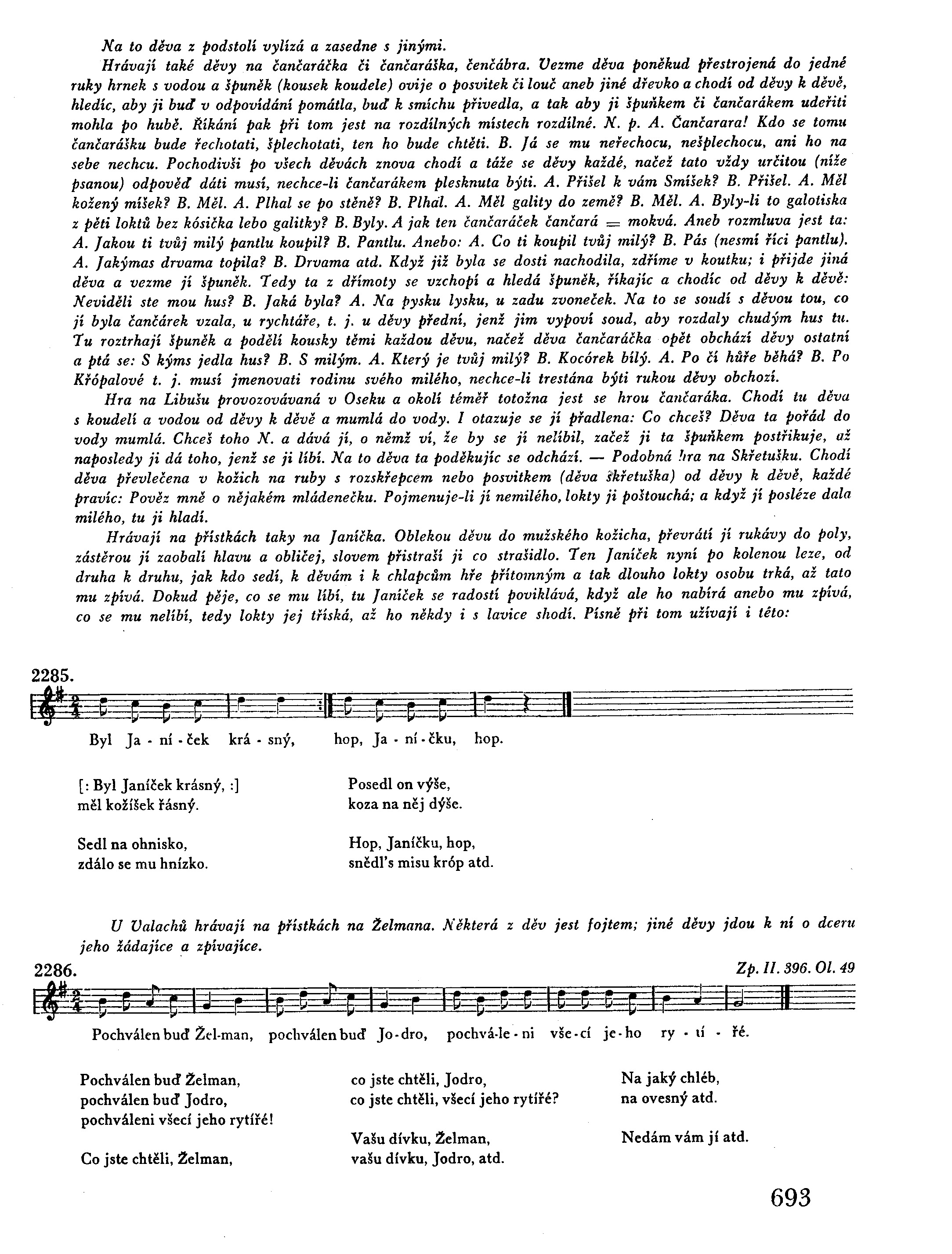 Co sa stało právě v Zemanovém dvore, vyrosteł rozmarýn výše okén hore. Néni to rozmarýn v zahradě saděný, ľež je to syneček doma vychovaný. Co sa stało právě v tem Ňorkovém dvore, vyrostła fijała výše okén hore. Néni to fijała v zahradě saděná, ľež je to Kačenka doma vychovaná. V tem Ňorkovém dvori borověnka stójí, ten synek Zemanů vyťat sa ju strójí. Do tu borověnku by sa strójił vyťat, nájprv si ju mosí od rodičů pýtat. Já sem si ju pýtał, oni ně ju daľi, Šak sa ti, Janíčku, nevýzhováraľi *). Děkuju ti. miłý, za tvoje chodění, ja že's nám ušľapał chodník prede dvermi. Ne tak prede dvermi jak na dołu dvorem, šak sa ně, můj miłý, dobre chodí po něm. A já tobě, miłá, za tvoju dobrotu, že's ně otvírała kažďunkú sobotu. Kažďunkú sobotu, sedumkrát za týdeň, možeš miłá vědět, že je to každý deň.