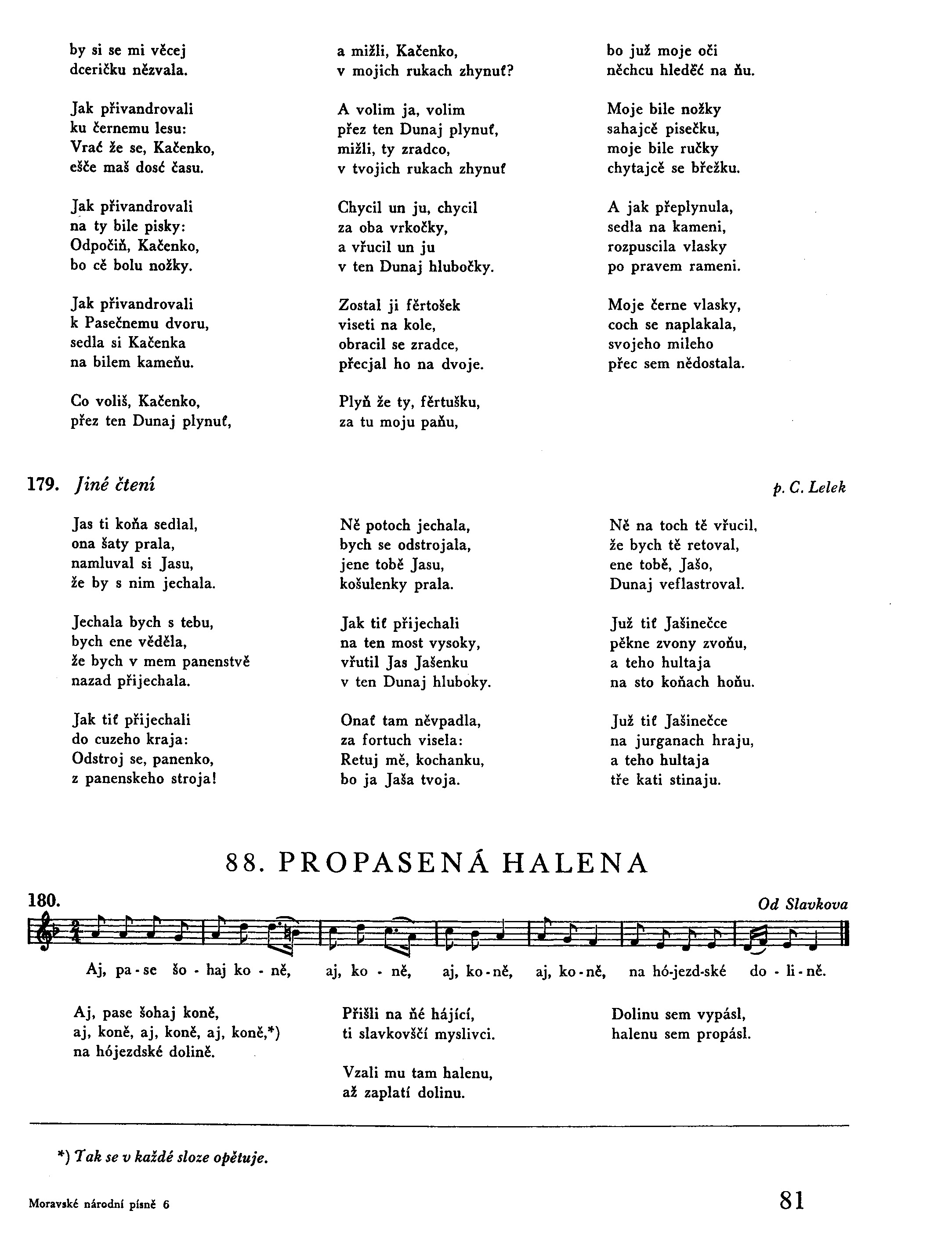 Aj, pase šohaj koně, aj, koně, aj, koně, *) na hójezdské dolině. Přišli na ňé hájící, ti slavkovščí myslivci. Vzali mu tam halenu, až zaplatí dolinu. Dolinu sem vypásl, halenu sem propásl.