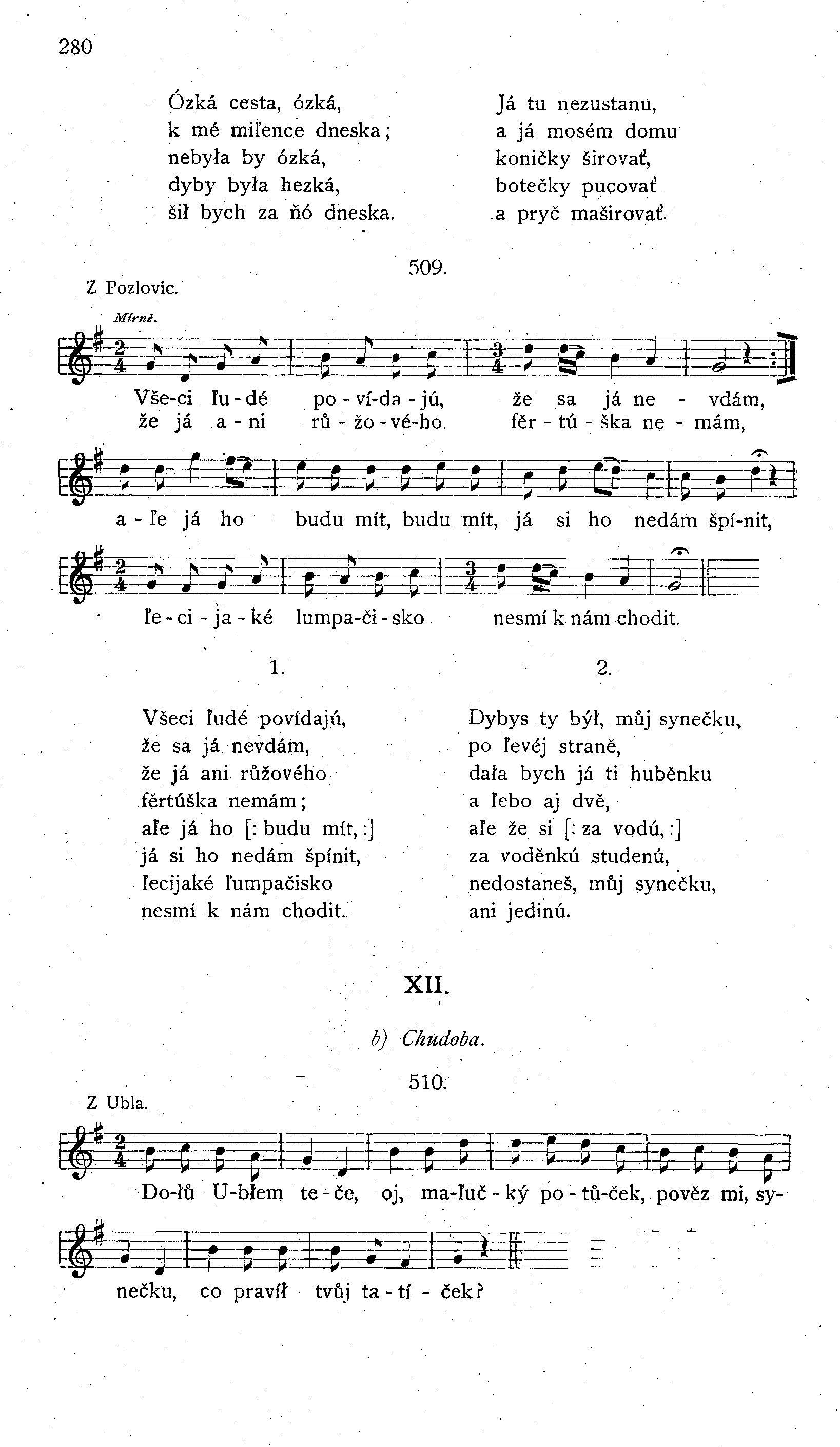 Dyž sem já byl na půł míľe miłá na mňa vołała: Pocem*) šohaj, duša moja, přenocuj tu do rána. A já sem jí tak povídał, že su tu aj s koníčkem, ona sobě utírała, sivé očka ručníčkem. Můj koníček, pěkný vraný, na něm pěkná čabraka, s Pánem Bohem ostávajte, vy Vrbecké děvčata.