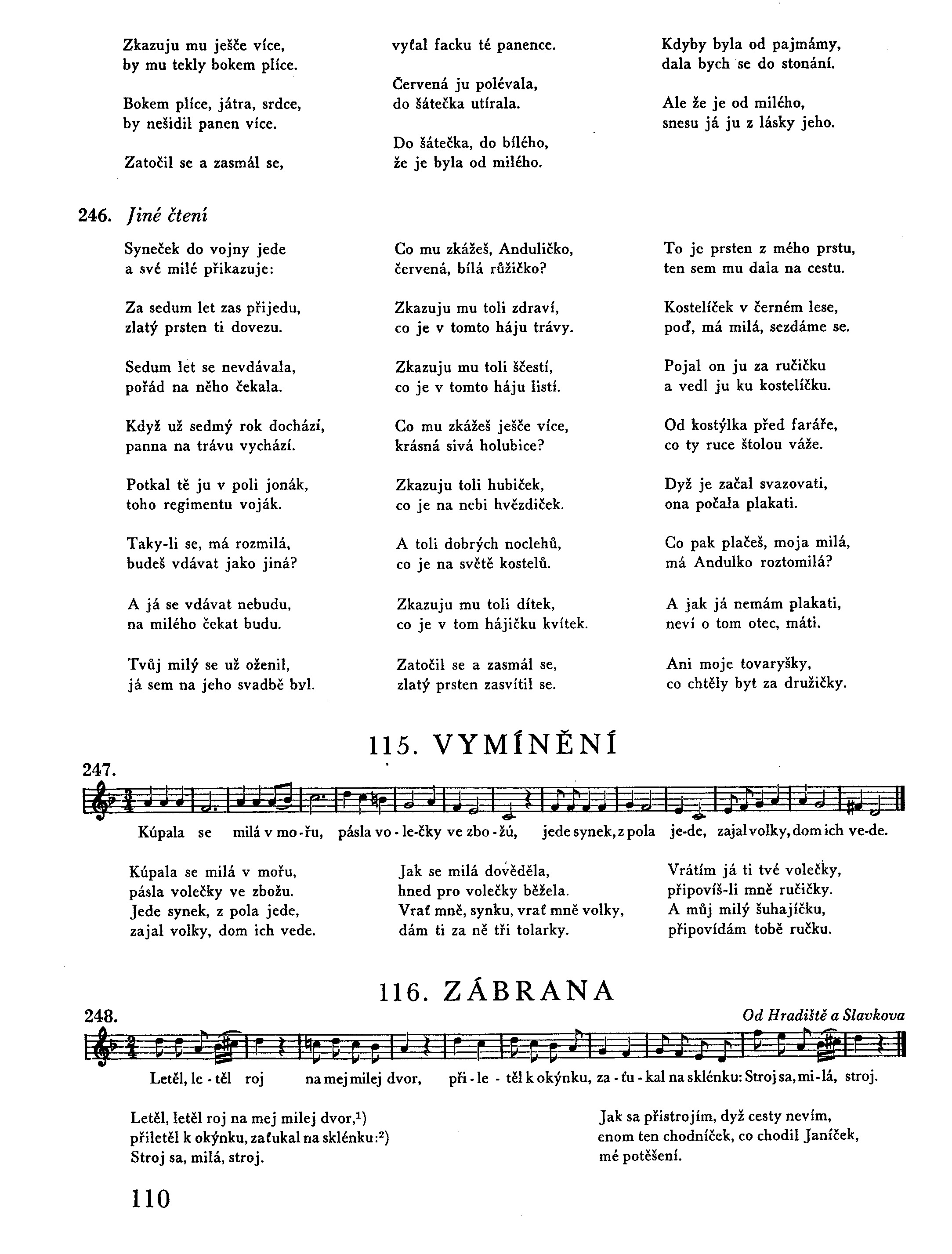 [: Co to, milá, za lásku máš? :] Dyž k vám přijdu, ty sa hněváš. Co bych já sa nehněvala? Obudils mia, jak sem spala. Možeš, milá, tepruv spáti, až já budu bojovati. Dyž tu budeš, budu aj já, budem bojovat obá dvá. 1) Malého my koňa máme, jak na něho posedáme? Ty si sedneš na koníčka a já půjdu podle bočka. 2) Dyž dojeli prostřed mořa: Slezaj, milá, dolů s koňa. Co sem ti já provinila, abych moře přeplavila? 3) Budu vědět povídati, jak je s milým bojovati. 4)