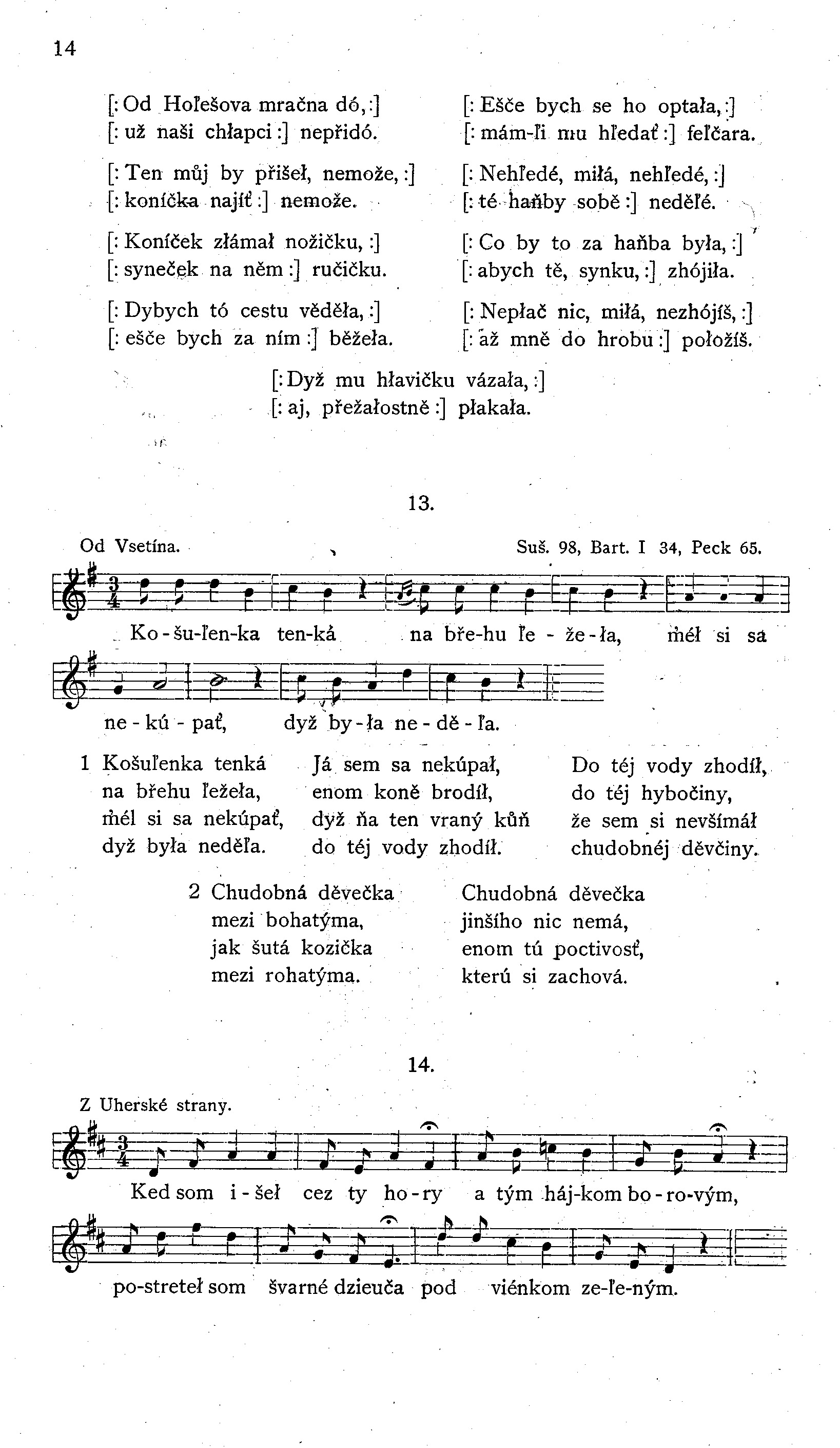 [: Pred nami je stromeček zeľený, :] [: na nom zpyévá słávyček vesełý; :] počuj, myłá, jak ten słávyk zpyévá, od ľubosci šetek svet rozľiéhá. [: Čo si, myłá, čo si taká smutná? :] [: či ty škodý vodenka studená? :] Neškodzí my vodenka studená, ľež ty chłapci, čo to za mnú chodá. [: Ked já budem ve vojne bojuvat, :] [: chto my bude na dome gazduvat? :] Mám já brata mładšího od sebe, nech gazduje mne aji pre tebe. [: O, mamyčko ved my on sľubuje :] [: že my veru za ným dobre bude; :] never, dcero, never słovám płaným, sľubujeć on dokaľs nenye za ným. [: A ked ta ráz do ruky dostane, :] [: bude ta byt dokaľ neustane, :] aj též vás tatýčko tak býjali, aľe ste jich preca rády maľi. [: O mamyčko, ved ma pekne vołá, :] [: ved som mu aj pérenko uviła :] tak mu svečí to pérenko ve dne, jako jeho byéłé ľíčko ke mne.