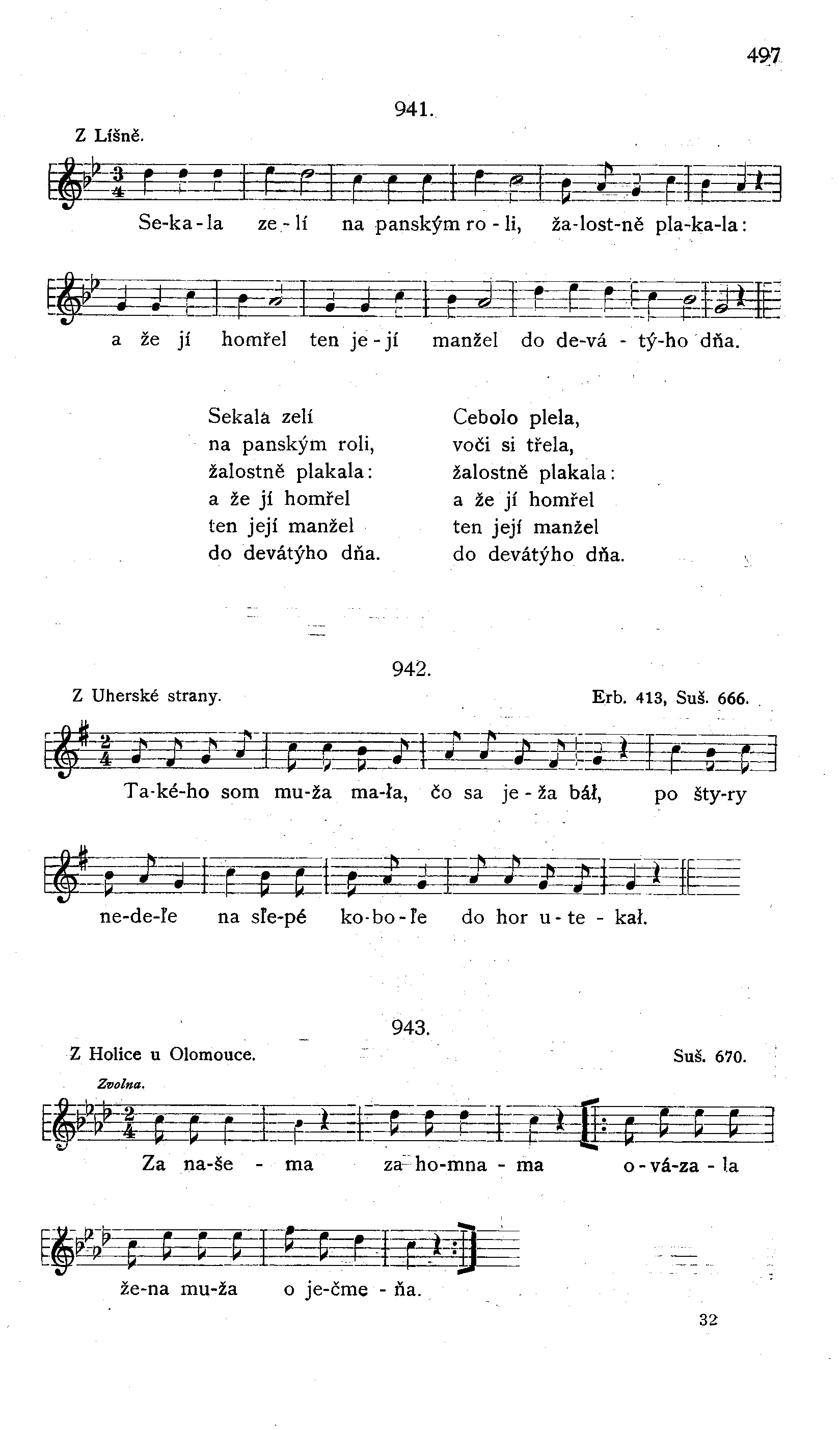 Sekala zelí na panským roli, žalostně plakala: a že jí homřel ten její manžel do devátýho dňa. Cebolo plela, voči si třela, žalostně plakala: a že jí homřel ten její manžel do devátýho dňa.
