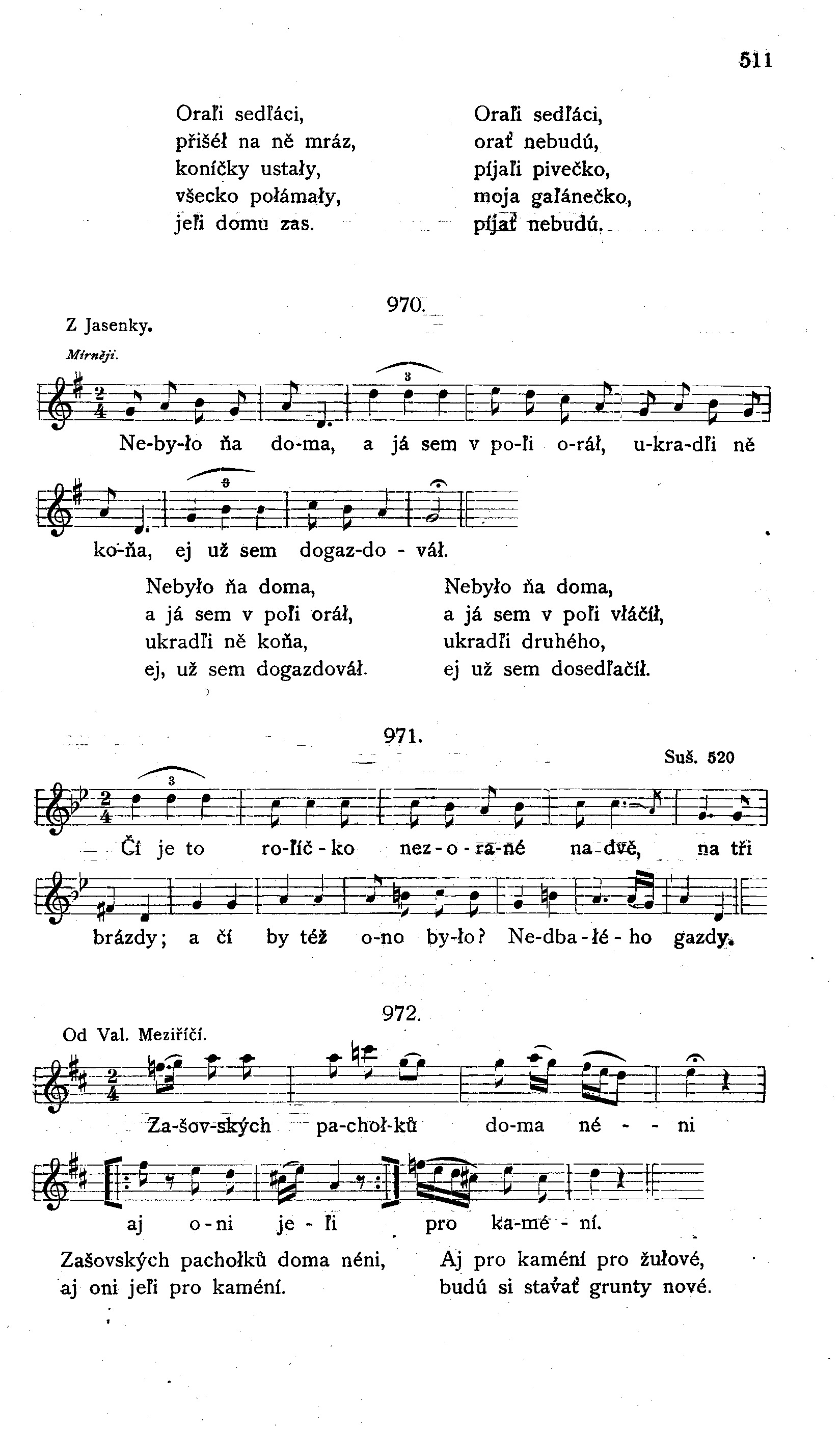 Stojí hruška v dole, vrch sa jí zelená; pod ňú sa Janiček s Aničkú v karty hrá. Tak sa oni hráli, až sa miuovali, od velikej uásky obá dvá zaspali. Zaspaua Anička na bíuém fertušku, zaspau i Janiček na červeném líčku. Zazpívau suavíček v zeleném hájičku, probudiu Janička, Janiček Aničku. Vstaň, Aničko, hore, staň, srdečko moje, staň, Aničko, čas máš, kravičky dojit máš. Létali, létali dva sokoli malí, až sa nalétali, zas dom doletěli. Má mamičko miuá, máte-li nás rádi, ustelte nám lože v tej novej komoře. *) Keď jim lože stuaua, zle jim vinšovaua, aby ta nevěsta rána nedočkaua. Skoro ráno staua, snídaní chystaua, pro synečka medu, pro nevěstu jedu. Uděuau sám Pán Bůh mezi tým proměnu, napiu sa syn jedu a nevěsta medu. Ponajprv sa napiu, hned huavičku skuoniu, po druhé sa napiu, poručenství suožiu. Tobě, miuá, tobě to stavení nové, co v něm leží, stojí, šecko bude tvoje. Tobě, matko, tobě ten Dunaj široký, ten Dunaj široký, na krk kameň mlýnský, abys nerušiua jak živ stav manželský.