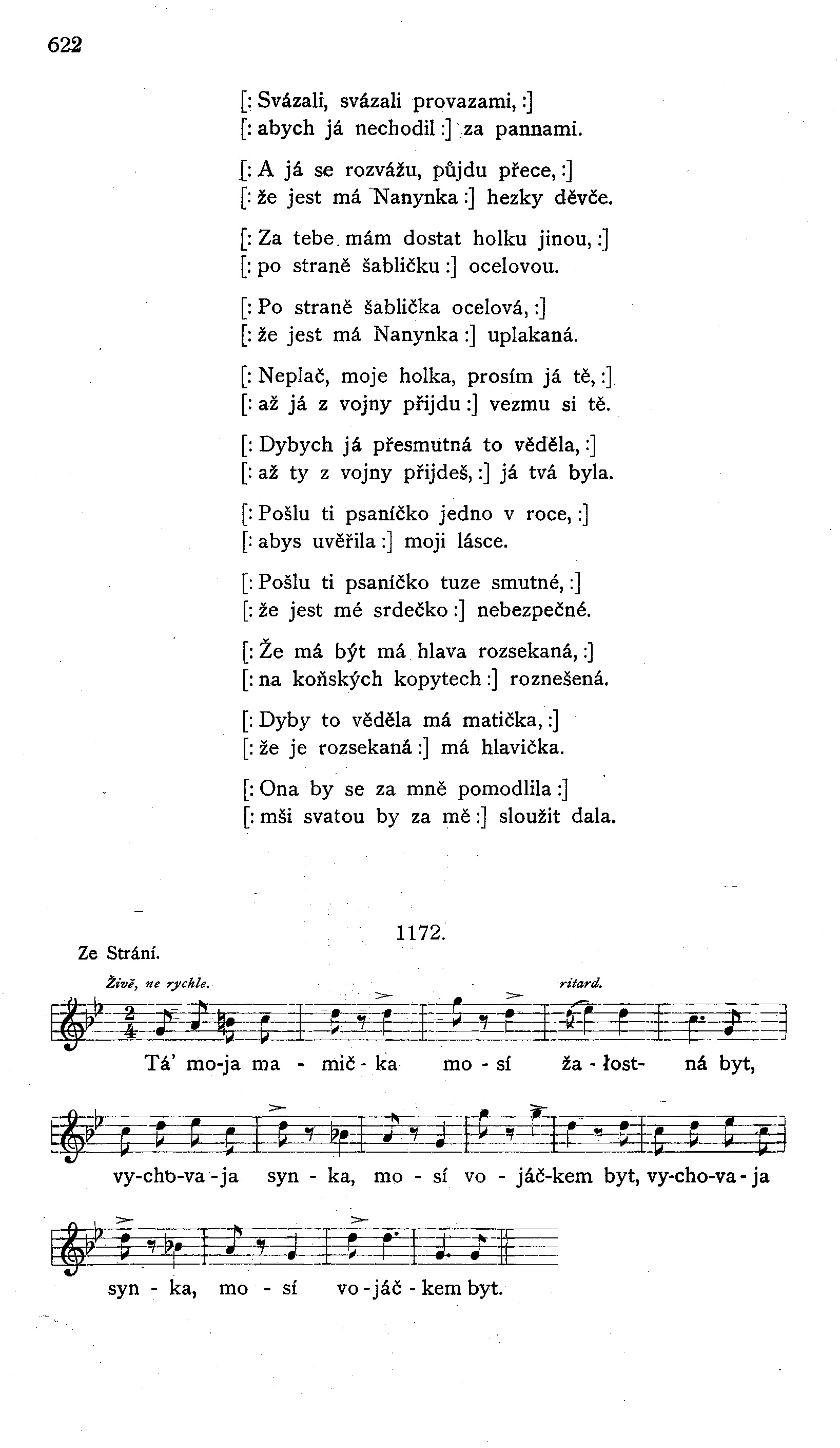 Tá moja mamička mosí žałostná byt, [: vychovaja synka, mosí vojáčkem byt. :] Vychovała synka jako Jezulátko, [: bude za ním płakat to švárné děvčátko. :] Bude za ním płakat a rukama łomit, [: škoda ťa, šohajku, škoda vojáčkem byt. :] Škoda ťa, šohajku, tvéj krvi červenéj, [: že ju mosíš vyľét na łúce zelenéj. :]