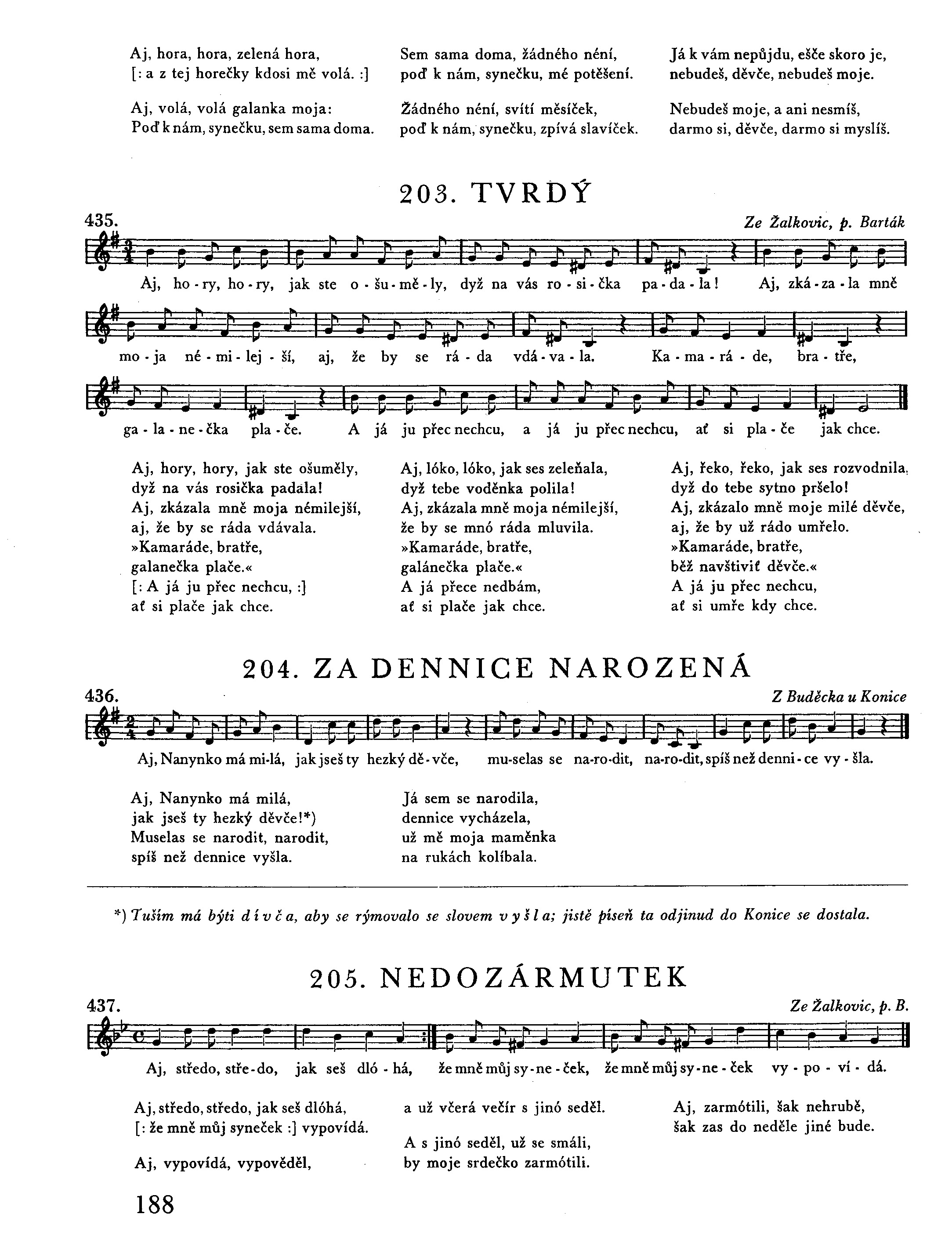 Kdy sem ja šel uličku, malu něveličku, nadešel sem svu milu, ona šla z noclehu. Milý, mocny Bože. *) Dal sem ja ji slovečko: Dař Pan Bůh, dzěvečko! A ona se ulekla, slovečka neřekla. Nělekaj se, ma mila, ja na cě něpovim. Což bys na mne povědzěl, dyž na mne nic něviš? A kata ja tež něvim, dy sem byl nad vami, ach, nad vami, nad vami, sam Pan Bůh nad nami. Což’s, mila, udzělala pod lipku zelenu? Pachole’s porodzila, tam’s ho zakopala. Něpovidaj, můj mily, dam ci na košulu, dam ci na košulu, baj ci ju ušiju. Což mi je po košuli? Košula se zdere, košula se zdere na mem hřišnem cěle, pachole něstaně. Něpovidaj, můj mily, dam ci prsteněček, zlaty prsteněček, zelený věneček. Což mi je po prstenku, po zelenem vinku? Prsteněk se zlame. 1) A vinek uvadně, pachole něstaně. Jak už bylo ve středu, už Kačenku vedu, už Kačenku vedu k mistu popravnimu. Pomodli se, Janičku, jednu modlitbičku, jednu modlitbičku za jeji dušičku.