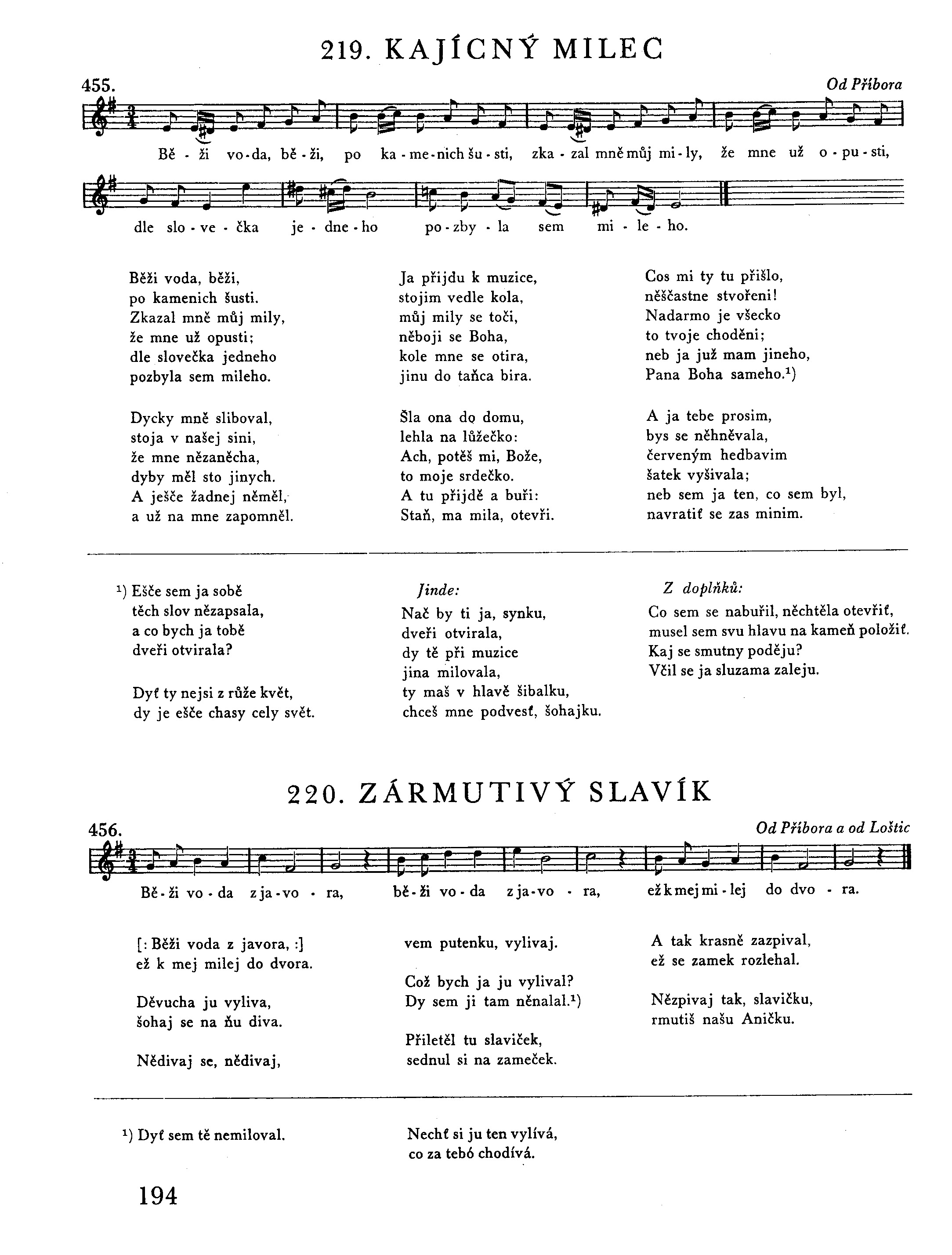 Běži voda, běži, po kamenich šusti. Zkazal mně můj mily, že mne už opusti; dle slovečka jedneho pozbyla sem milého. Dycky mně sliboval, stoja v našej sini, že mne nězaněcha, dyby měl sto jinych. A ješče žadnej něměl, a už na mne zapomněl. Ja přijdu k muzice, stojim vedle kola, můj mily se toči, něboji se Boha, kole mne se otira, jinu do taňca bira. Šla ona do domu, lehla na lůžečko: Ach, potěš mi, Bože, to moje srdečko. A tu přijdě a buři: Staň, ma mila, otevři. Cos mi ty tu přišlo, něščastne stvořeni! Nadarmo je všecko to tvoje choděni; neb ja juž mam jineho, Pana Boha sameho.1) A ja tebe prosim, bys se něhněvala, červeným hedbavim šatek vyšivala; neb sem ja ten, co sem byl, navratiť se zas minim.