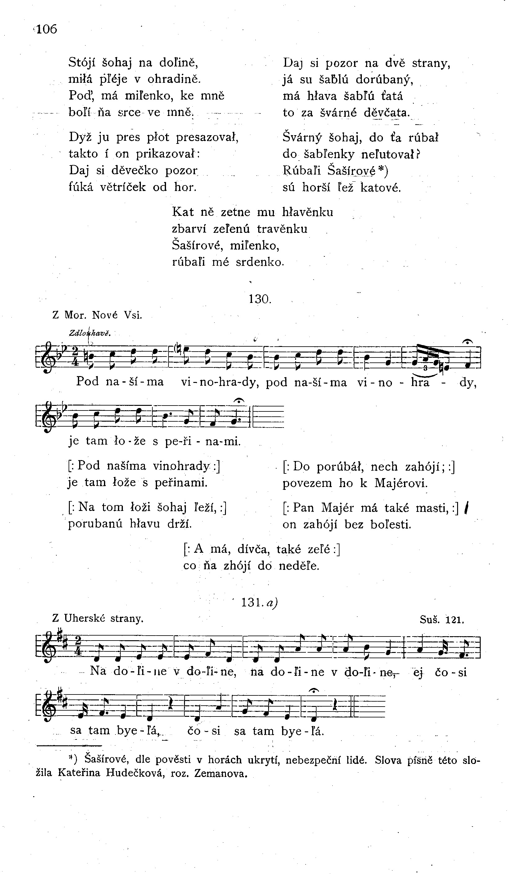 [: Pod našíma vinohrady :] je tam łože s peřinami. [: Na tom łoži šohaj ľeží, :] porubanú hłavu drží. [: Do porúbáł, nech zahójí; :] povezem ho k Majérovi. [: Pan Majér má také masti, :] on zahójí bez boľesti. [: A má, dívča, také zeľé :] co ňa zhójí do neděľe.